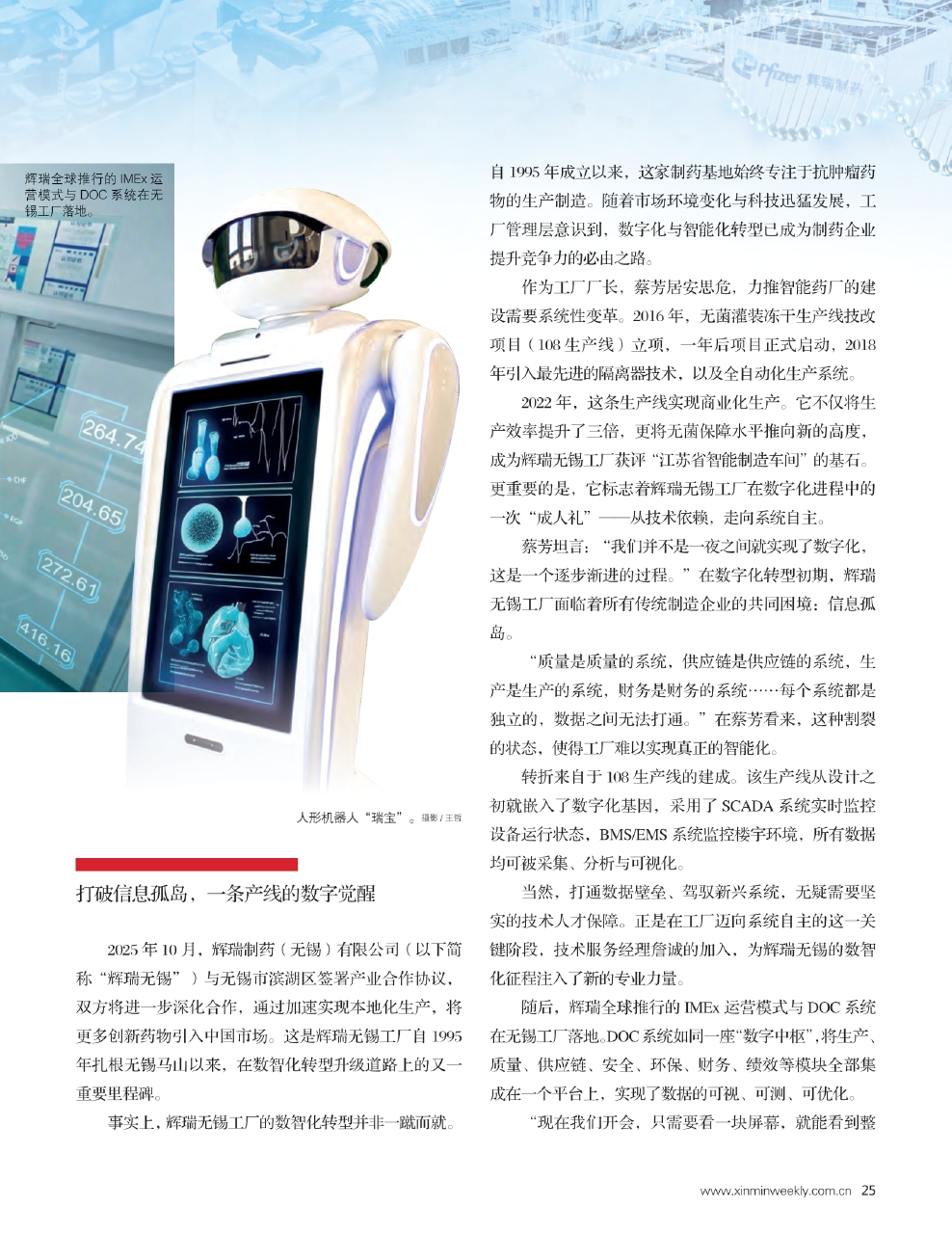 2025年11月13日,在辉瑞无锡工厂,辉瑞制药(无锡)有限公司工厂厂长蔡芳接受《新民周刊》采访时表示,新技术日新月异的今天,制药企业面临全新的机遇和挑战。