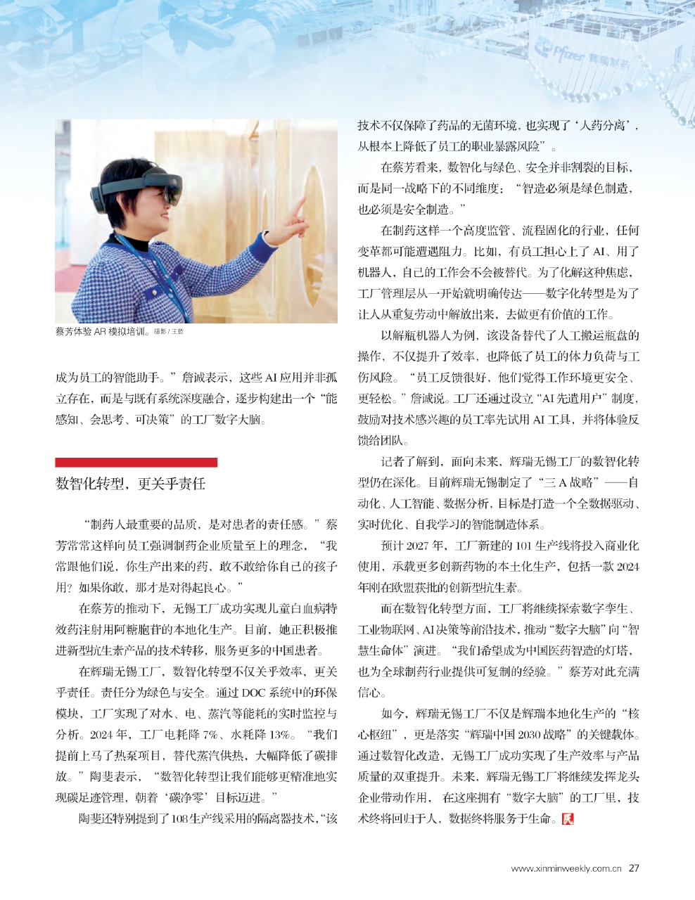 2025年11月13日,在辉瑞无锡工厂,辉瑞制药(无锡)有限公司工厂厂长蔡芳接受《新民周刊》采访时表示,新技术日新月异的今天,制药企业面临全新的机遇和挑战。