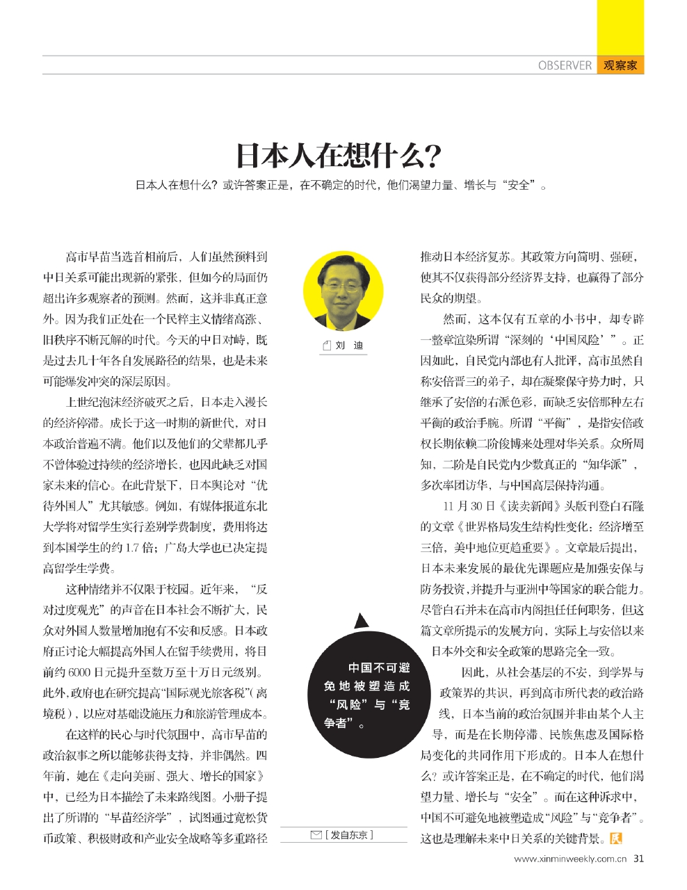 因此,从社会基层的不安,到学界与政策界的共识,再到高市所代表的政治路线,日本当前的政治氛围并非由某个人主导,而是在长期停滞、民族焦虑及国际格局变化的共同作用下形成的。日本人在想什么?或许答案正是,在不确定的时代,他们渴望力量、增长与“安全”。而在这种诉求中,中国不可避免地被塑造成“风险”与“竞争者”。这也是理解未来中日关系的关键背景。
