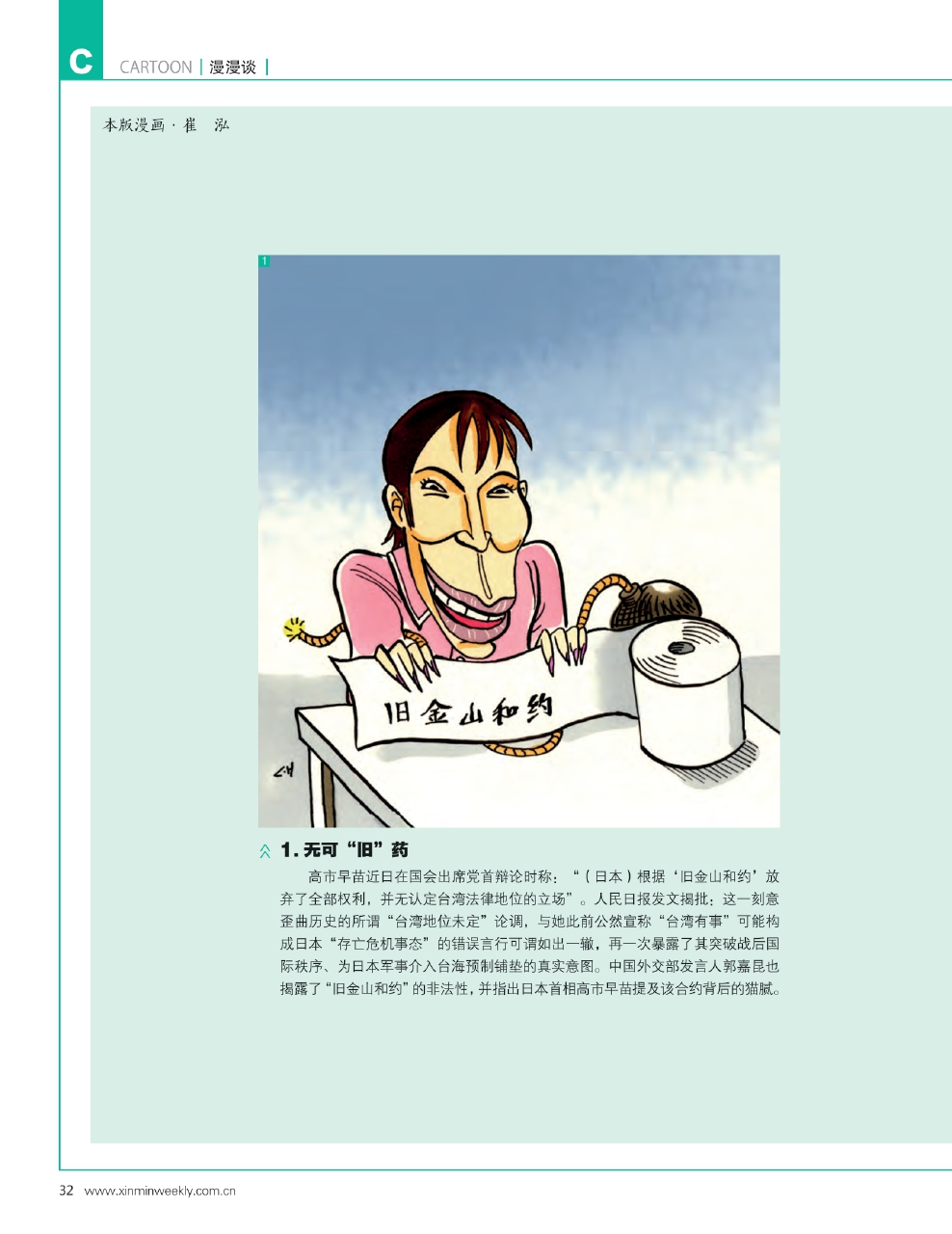 1.无可“旧”药 高市早苗近日在国会出席党首辩论时称:“(日本)根据‘旧金山和约’放弃了全部权利,并无认定台湾法律地位的立场”。人民日报发文揭批:这一刻意歪曲历史的所谓“台湾地位未定”论调,与她此前公然宣称“台湾有事”可能构成日本“存亡危机事态”的错误言行可谓如出一辙,再一次暴露了其突破战后国际秩序、为日本军事介入台海预制铺垫的真实意图。中国外交部发言人郭嘉昆也揭露了“旧金山和约”的非法性,并指出日本首相高市早苗提及该合约背后的猫腻。