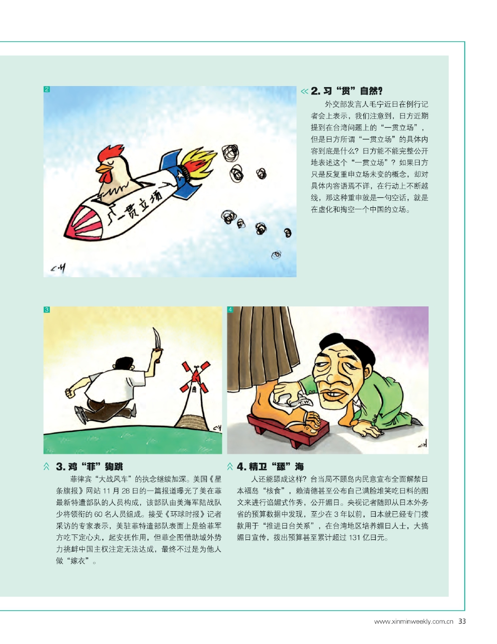 3.鸡“菲”狗跳 菲律宾“大战风车”的执念继续加深。美国《星条旗报》网站11月28日的一篇报道曝光了美在菲最新特遣部队的人员构成,该部队由美海军陆战队少将领衔的60名人员组成。接受《环球时报》记者采访的专家表示,美驻菲特遣部队表面上是给菲军方吃下定心丸,起安抚作用,但菲企图借助域外势力挑衅中国主权注定无法达成,最终不过是为他人做“嫁衣”。