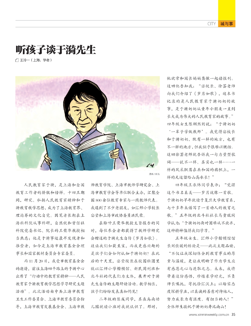 二年级的陈彧同学,其在乌南幼儿园就读小班时我就认识了。那时,他就常和园长妈妈龚敏一起读报刊。这回他告知我:“宓校长、徐芸老师向我们介绍了《岁月如歌》,这本书记录的是人民教育家于漪奶奶的故事,是于漪奶奶从童年小朋友一直到长大成为伟大的人民教育家的故事。”四年级女生陈珚然则说:“于漪奶奶‘一辈子学做教师’。我觉得宓校长和于漪奶奶,既有一样的地方,也有不一样的地方,但我似乎很难以概括。这回徐芸老师就告诉我一句力量型歌词——说不一样、其实也一样……一样的风采飘荡在共和国的旗帜上,一样的足迹留给山高水长!”