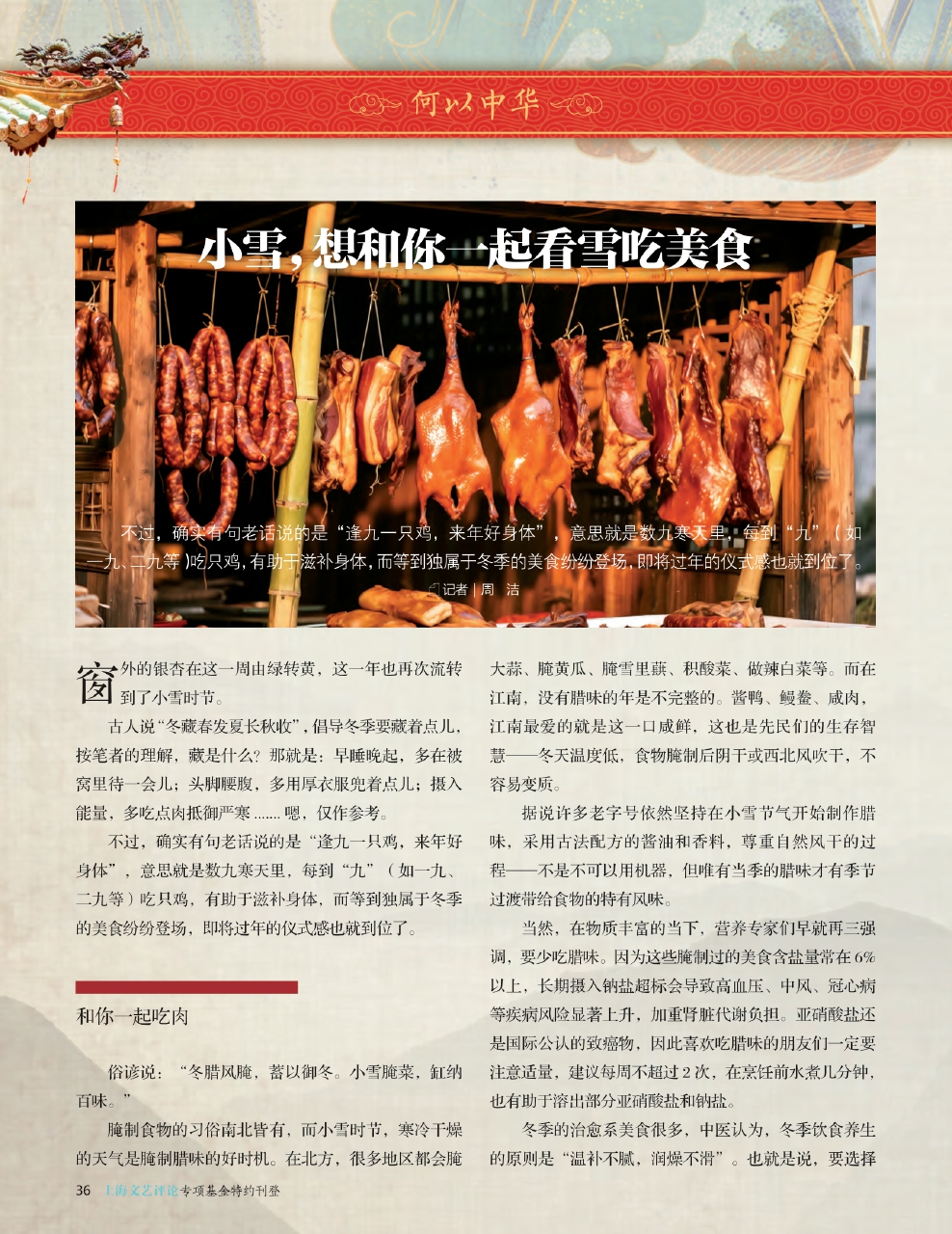 据说许多老字号依然坚持在小雪节气开始制作腊味,采用古法配方的酱油和香料,尊重自然风干的过程——不是不可以用机器,但唯有当季的腊味才有季节过渡带给食物的特有风味。