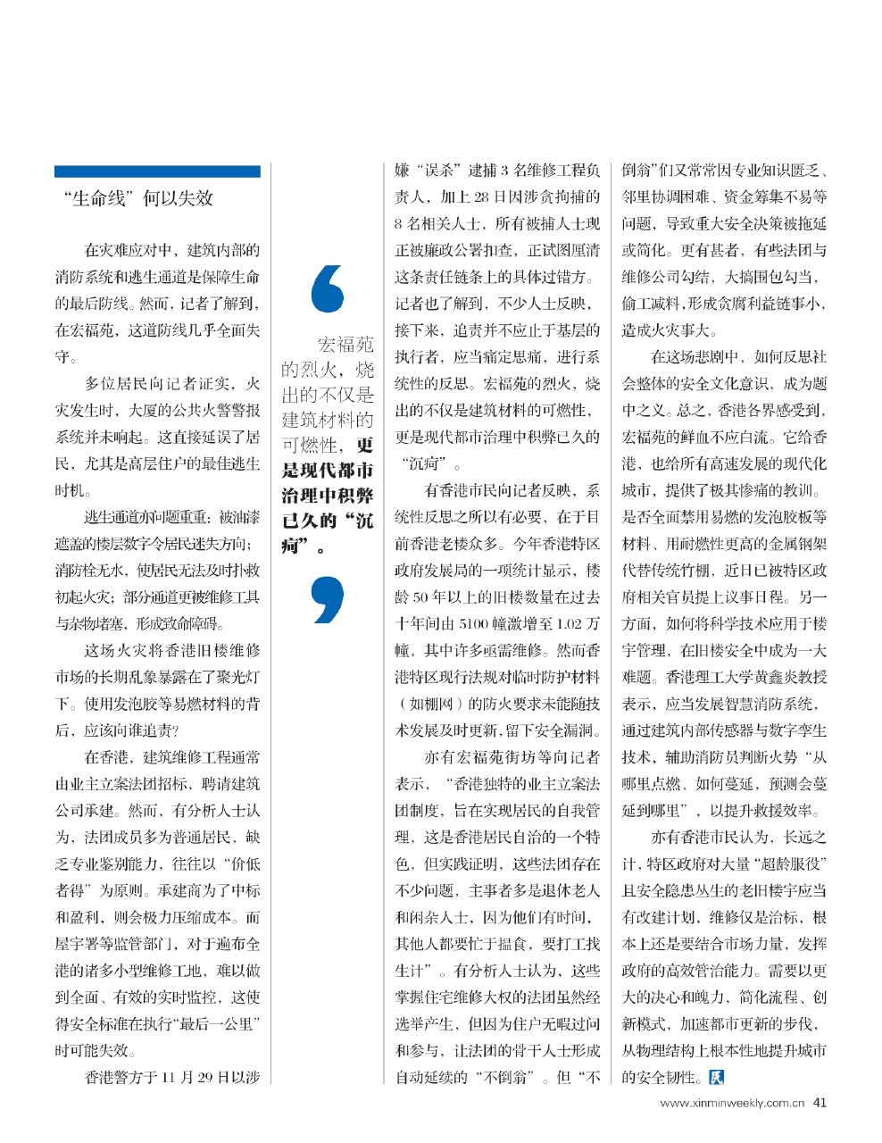 这场并非源于地震、战争等不可抗力的灾难,让香港都市繁华表象下城市安全方面之脆弱处,表露无遗;也为诸多大型城市高楼楼宇安全敲响一记警钟。