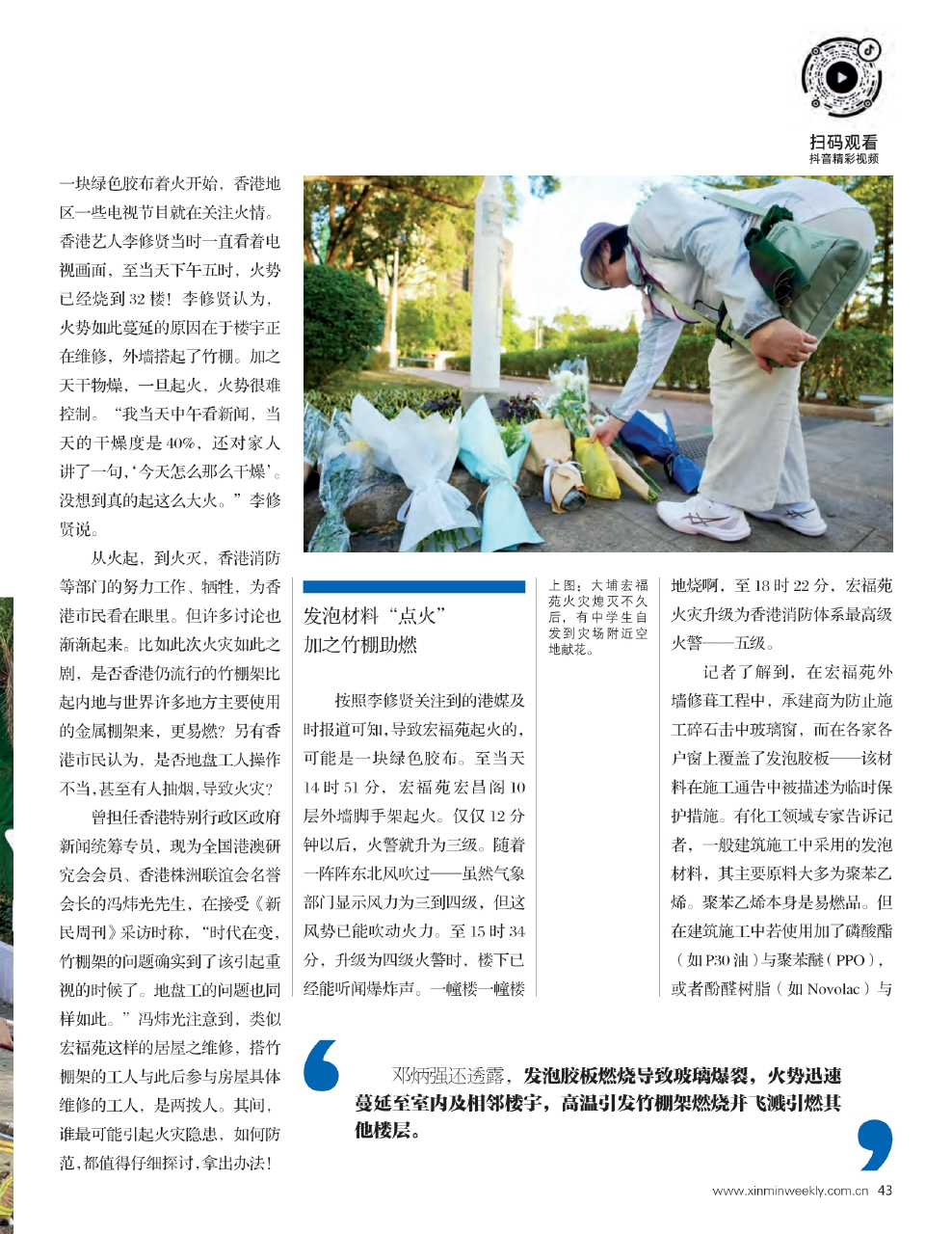 曾担任香港特别行政区政府新闻统筹专员,现为全国港澳研究会会员、香港株洲联谊会名誉会长的冯炜光先生,在接受《新民周刊》采访时称,“时代在变,竹棚架的问题确实到了该引起重视的时候了。地盘工的问题也同样如此。”冯炜光注意到,类似宏福苑这样的居屋之维修,搭竹棚架的工人与此后参与房屋具体维修的工人,是两拨人。其间,谁最可能引起火灾隐患,如何防范,都值得仔细探讨,拿出办法!