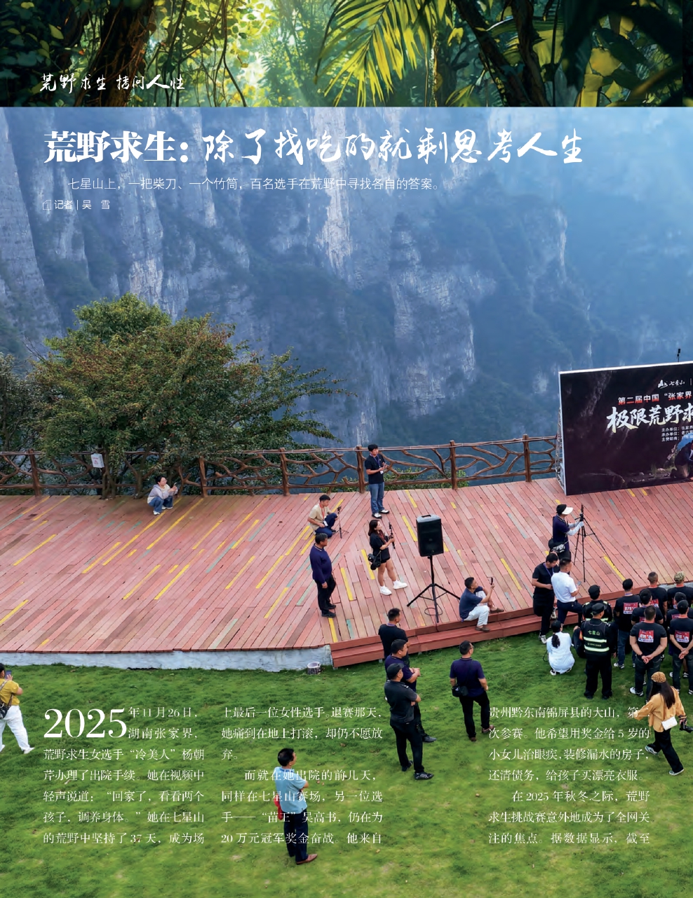 在这片没有剧本的荒野里,有人为生存而战,有人为家庭而拼,也有人只为在极限中寻找自己。七星山荒野求生挑战赛主办方负责人田健兵在接受《新民周刊》采访时坦言,选手参赛的原因大致可分为三类:“一类是希望改善家庭条件,为赢得奖金奋力一搏;一类是想挑战自我,突破极限;还有一类,是来体验另一种人生。”