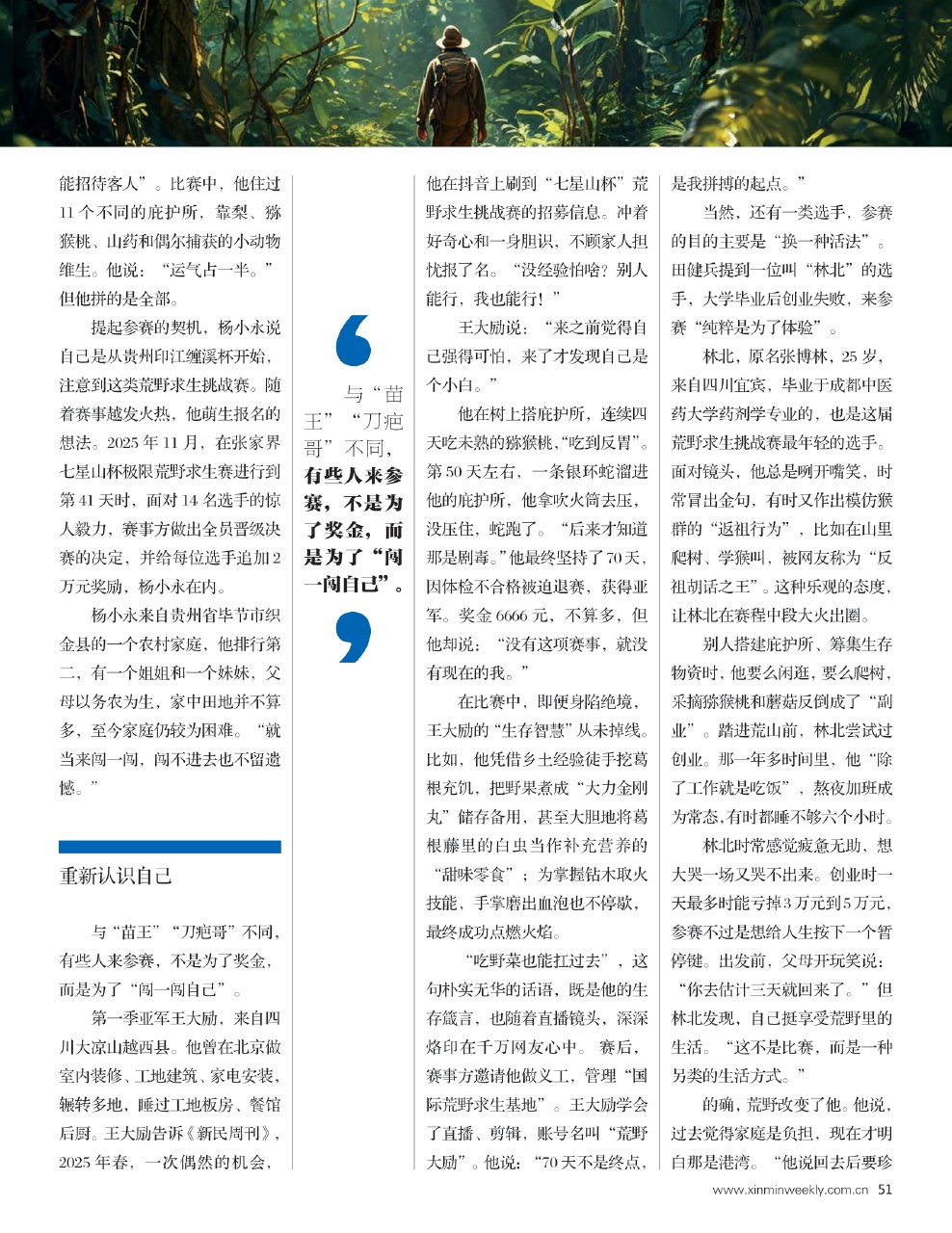 面对“是否有剧本”的质疑,田健兵告诉《新民周刊》:“他们脸上的汗水、身上的健康色,以及眼中透出的光芒,这些都是最真实的勋章,无法伪装。”选手们并不完美,在这场历练中,每位选手都在超越自我:有人误食野菜后学会了谨慎,有人因寂寞痛哭,有人因伤痛退赛,也展现了勇气。“他们就是个普通人,能坚持下来,靠的是一股劲儿。而坚持本身就是一种胜利。”