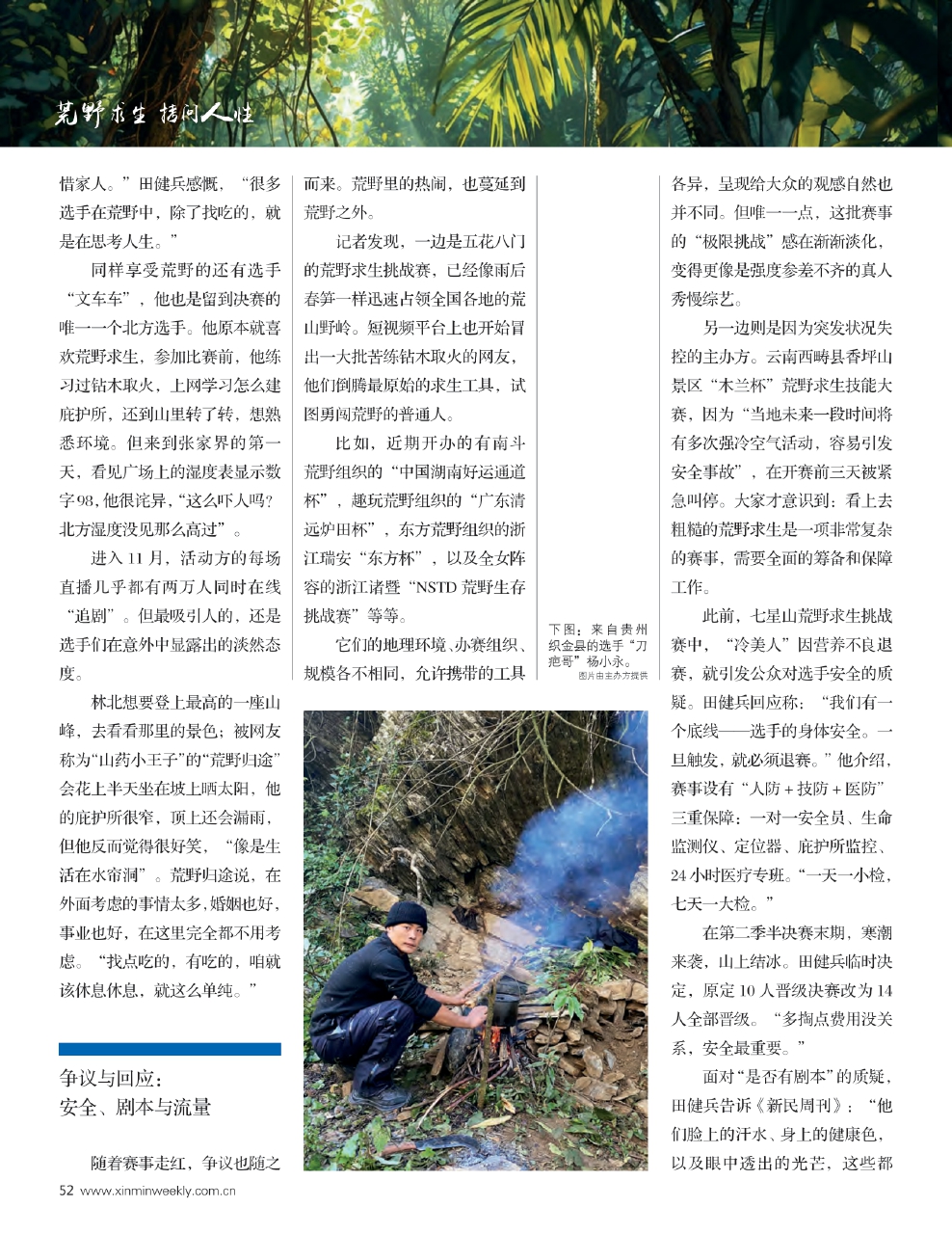 面对“是否有剧本”的质疑,田健兵告诉《新民周刊》:“他们脸上的汗水、身上的健康色,以及眼中透出的光芒,这些都是最真实的勋章,无法伪装。”选手们并不完美,在这场历练中,每位选手都在超越自我:有人误食野菜后学会了谨慎,有人因寂寞痛哭,有人因伤痛退赛,也展现了勇气。“他们就是个普通人,能坚持下来,靠的是一股劲儿。而坚持本身就是一种胜利。”