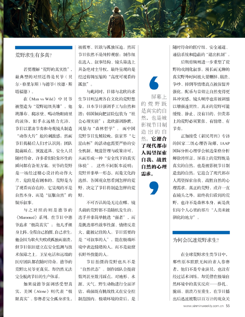 正如接受《新民周刊》专访的国家二级心理咨询师,IAAP国际分析心理学会候选荣格分析师徐涛所言,屏幕上的荒野既是真实的自然,也是被影视节目制造出的自然。它迎合了现代都市人渴望探索自我、战胜自然的心理需求。真正的荒野,或许一直在镜头之外。最终我们看到的荒野,也许不是森林本身,而是我们每个人心里的那片“人类未被驯化的地方”。