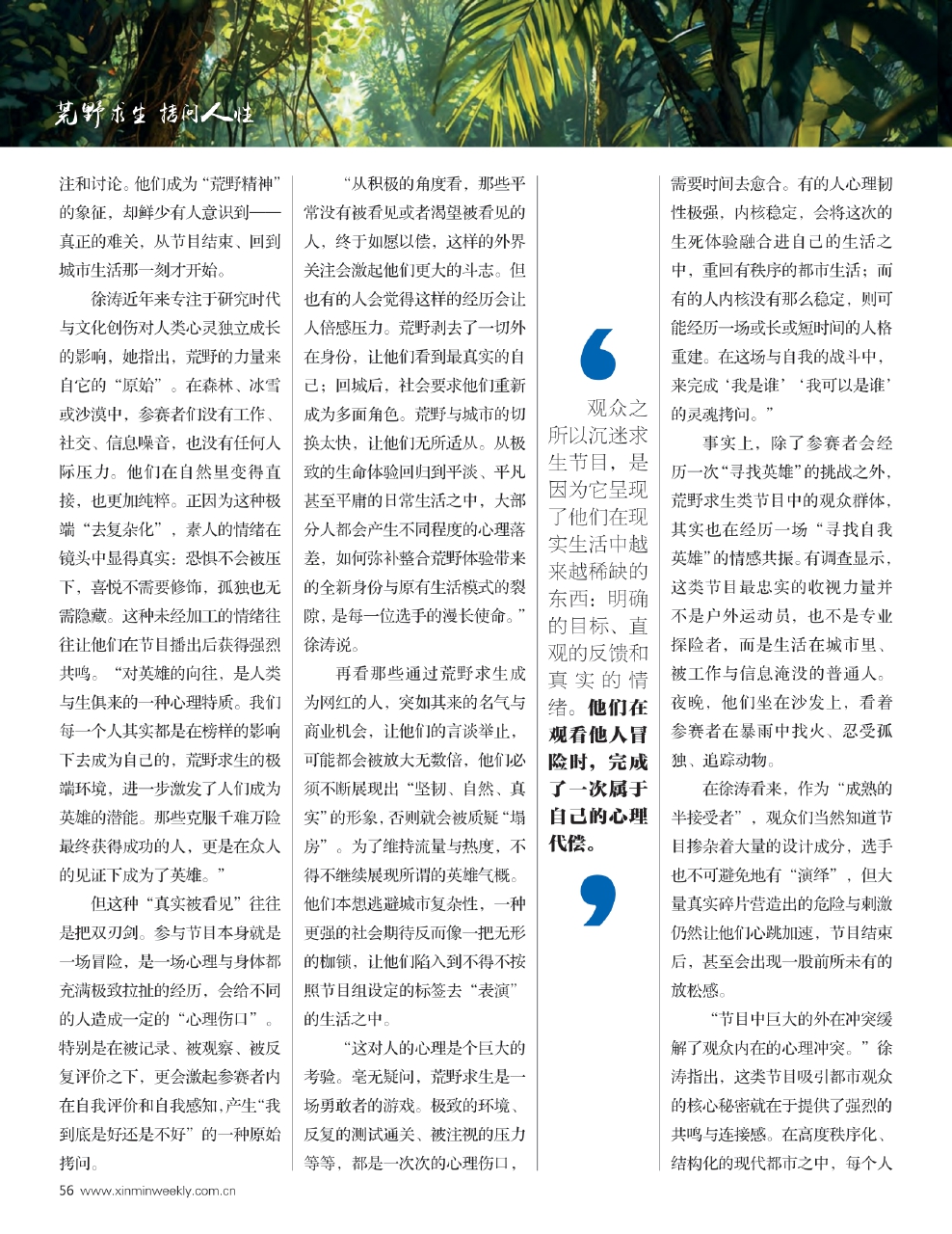 正如接受《新民周刊》专访的国家二级心理咨询师,IAAP国际分析心理学会候选荣格分析师徐涛所言,屏幕上的荒野既是真实的自然,也是被影视节目制造出的自然。它迎合了现代都市人渴望探索自我、战胜自然的心理需求。真正的荒野,或许一直在镜头之外。最终我们看到的荒野,也许不是森林本身,而是我们每个人心里的那片“人类未被驯化的地方”。