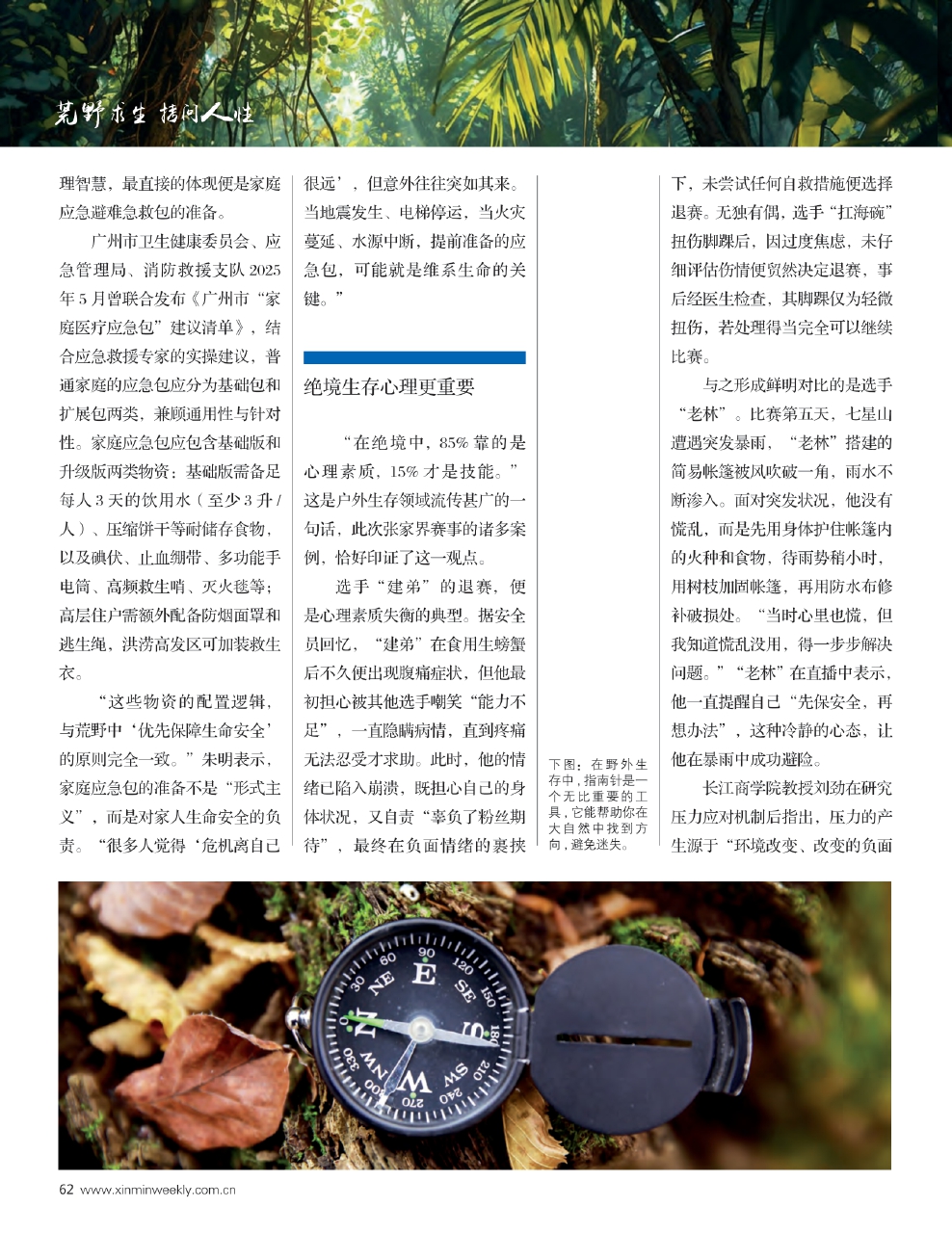 不可否认的是,荒野求生中蕴含的“优先级管理”“风险预判”等核心智慧,在现代生活的应急场景中具有重要价值。朱明指出,“在绝境中,必须明确生存优先级:首先保障生命安全,其次维持基本生存需求,最后保持积极心态”。他表示,这种优先级管理智慧,最直接的体现便是家庭应急避难急救包的准备。
