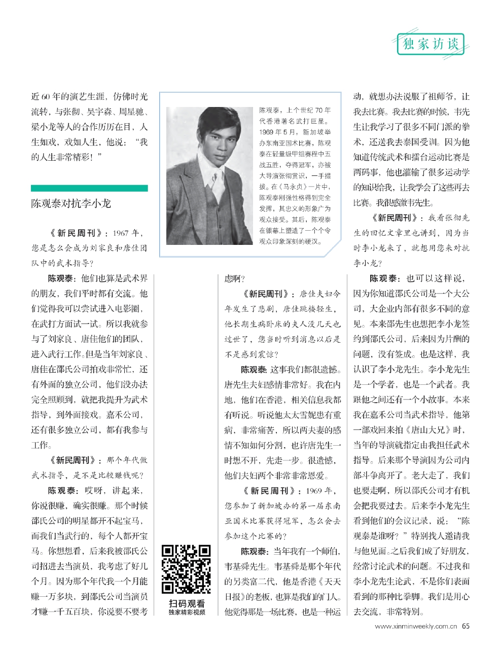 马永贞、洪熙官、九纹龙史进、大刀王五……他在银幕上塑造了一个个性格鲜明的硬汉形象。硬桥硬马,豪气干云,以其极具代表性的动作与形象成为真正的银幕英雄。11月19日,《新民周刊》记者在广东中山专访了陈观泰先生,这位80岁的香港功夫片老前辈和记者聊起他近60年的演艺生涯,仿佛时光流转,与张彻、吴宇森、周星驰、梁小龙等人的合作历历在目,人生如戏,戏如人生,他说:“我的人生非常精彩!”