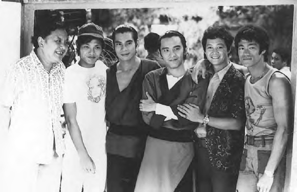 上图:李小龙探班《刺马》片场,右一李小龙,左一张彻、左三陈观泰,左四姜大卫。