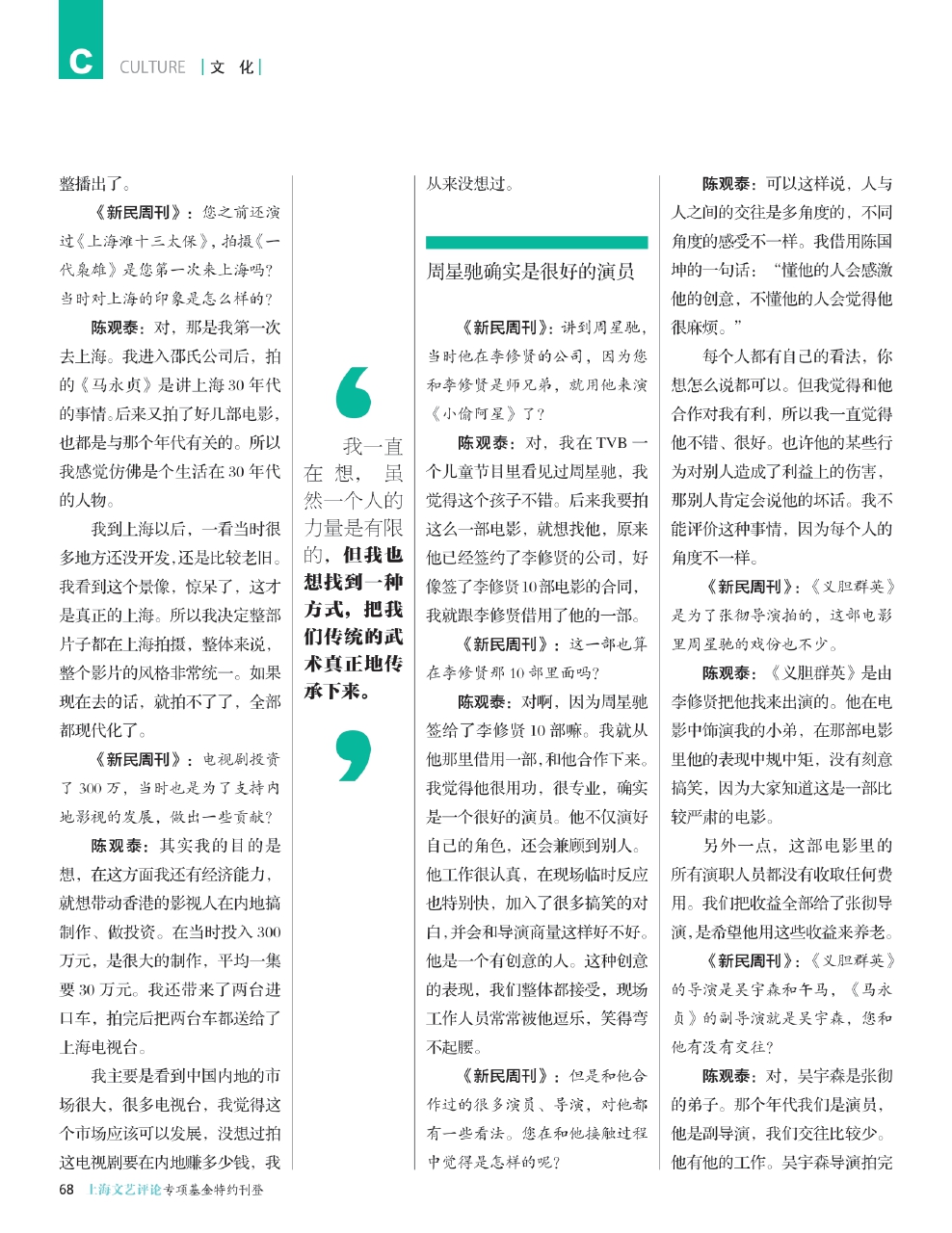 马永贞、洪熙官、九纹龙史进、大刀王五……他在银幕上塑造了一个个性格鲜明的硬汉形象。硬桥硬马,豪气干云,以其极具代表性的动作与形象成为真正的银幕英雄。11月19日,《新民周刊》记者在广东中山专访了陈观泰先生,这位80岁的香港功夫片老前辈和记者聊起他近60年的演艺生涯,仿佛时光流转,与张彻、吴宇森、周星驰、梁小龙等人的合作历历在目,人生如戏,戏如人生,他说:“我的人生非常精彩!”