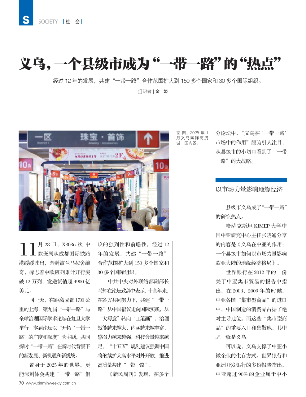 “义乌在中亚的作用一方面是微观的,体现在一个塑料盆、一双袜子、一台小电风扇上,但是义乌的重要作用也是宏观的,体现在贸易统计、班列线路和区域互联互通的格局当中。所以说在地缘经济时代,一个县级市正通过市场力量、商人网络和物流通道悄然参与到了欧亚大陆秩序的重塑之中。”张晓通总结道。