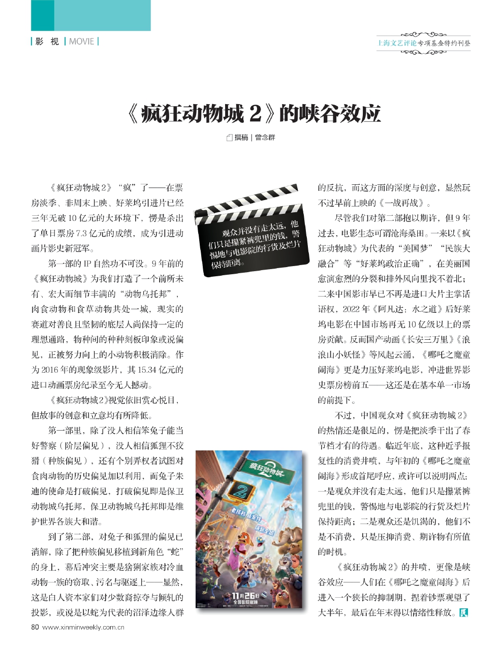 《疯狂动物城2》的井喷,更像是峡谷效应——人们在《哪吒之魔童闹海》后进入一个狭长的抑制期,捏着钞票观望了大半年,最后在年末得以情绪性释放。