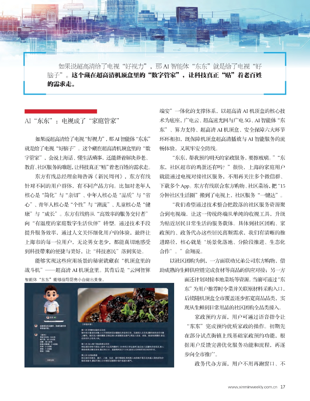东方有线总经理俞翔告诉《新民周刊》,东方有线针对不同的用户群体,有不同产品方向。比如对老年人核心是“简化”与“亲切”、中年人核心是“品质”与“省心”、青年人核心是“个性”与“潮流”、儿童核心是“健康”与“成长”。东方有线将从“高效率的服务交付者”向“有温度的家庭数字生活伙伴”转型。通过技术手段提升服务效率,通过人文关怀细化用户的体验,最终让上海市的每一位用户,无论男女老少,都能真切地感受到科技带来的便捷与美好,让“科技惠民”落到实处。