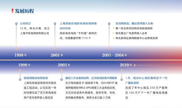 成立于1998年12月的上海广播电视台(集团)旗下东方有线网络有限公司,迄今已经走过27载春秋,从最初的一家有线网络公司,到如今业务涵盖广电5G移动通信、高清互动电视、个人宽带、企业数据、智慧城市、物联网等相关领域,是全业务、全品类的第四运营商。