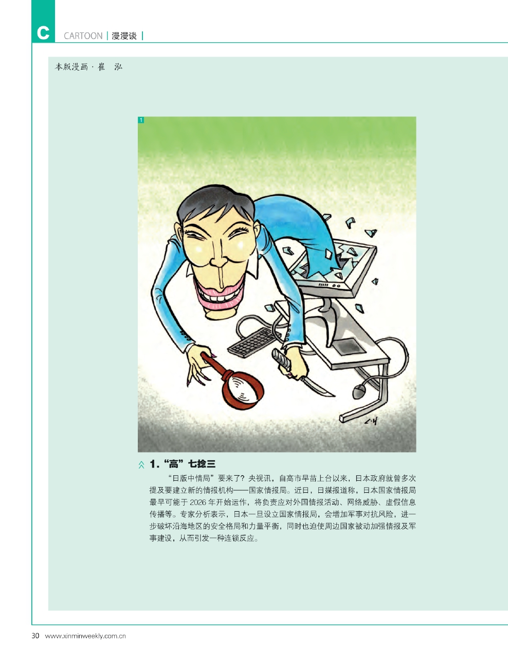 1.“高”七捻三 “日版中情局”要来了?央视讯,自高市早苗上台以来,日本政府就曾多次提及要建立新的情报机构——国家情报局。近日,日媒报道称,日本国家情报局最早可能于2026年开始运作,将负责应对外国情报活动、网络威胁、虚假信息传播等。专家分析表示,日本一旦设立国家情报局,会增加军事对抗风险,进一步破坏沿海地区的安全格局和力量平衡,同时也迫使周边国家被动加强情报及军事建设,从而引发一种连锁反应。