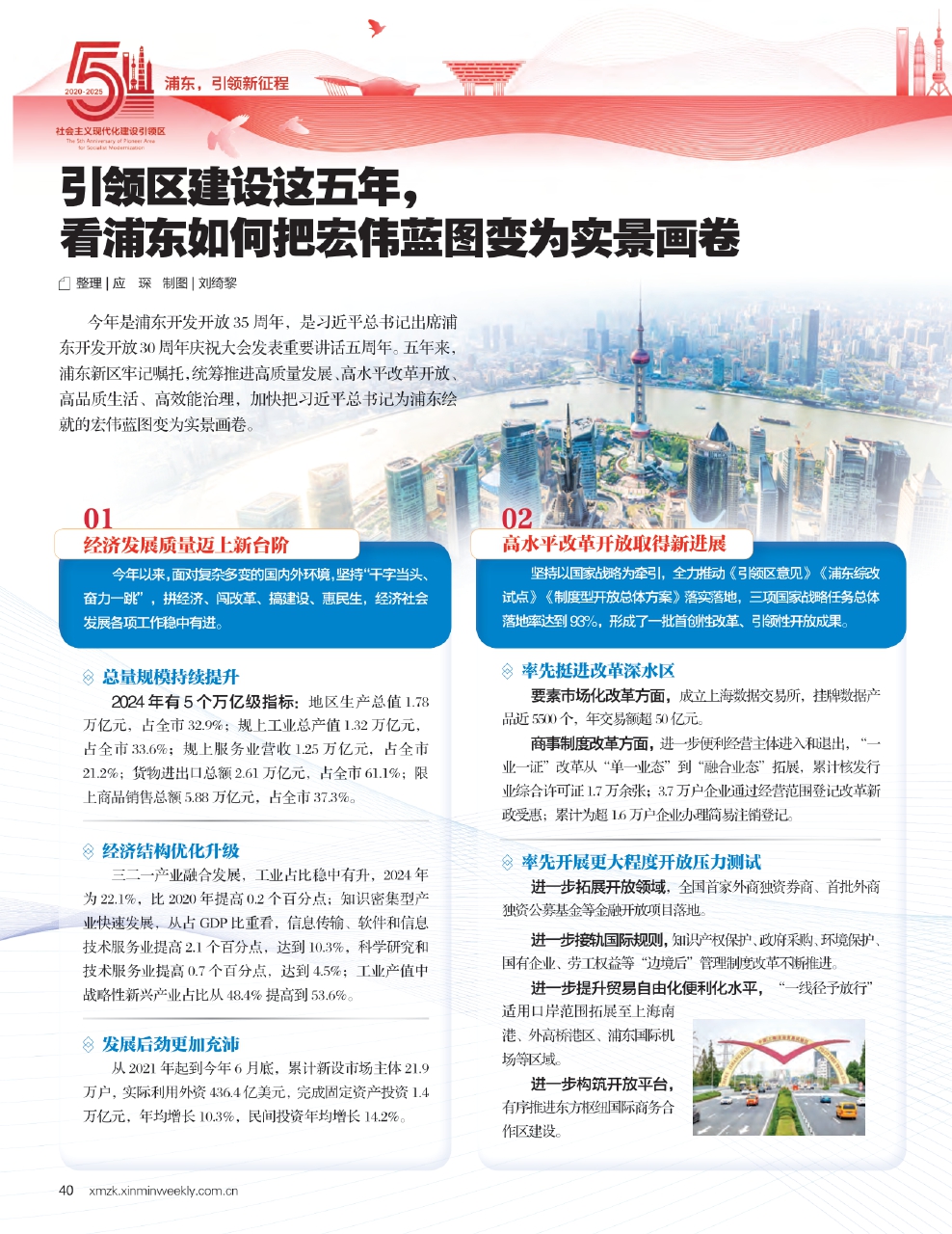 今年是浦东开发开放35周年,是习近平总书记出席浦东开发开放30周年庆祝大会发表重要讲话五周年。五年来,浦东新区牢记嘱托,统筹推进高质量发展、高水平改革开放、高品质生活、高效能治理,加快把习近平总书记为浦东绘就的宏伟蓝图变为实景画卷。