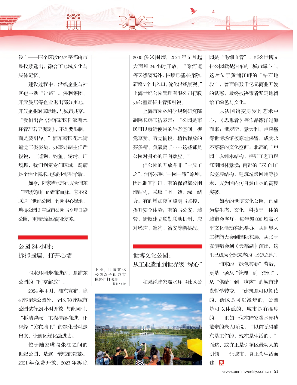 2024年4月,浦东宣布,除4座特殊公园外,全区78座城市公园试行24小时开放。与此同时,“拆墙透绿”工程持续推进,让曾经“关在墙里”的绿化景观走出来,让街区绿化融进去。