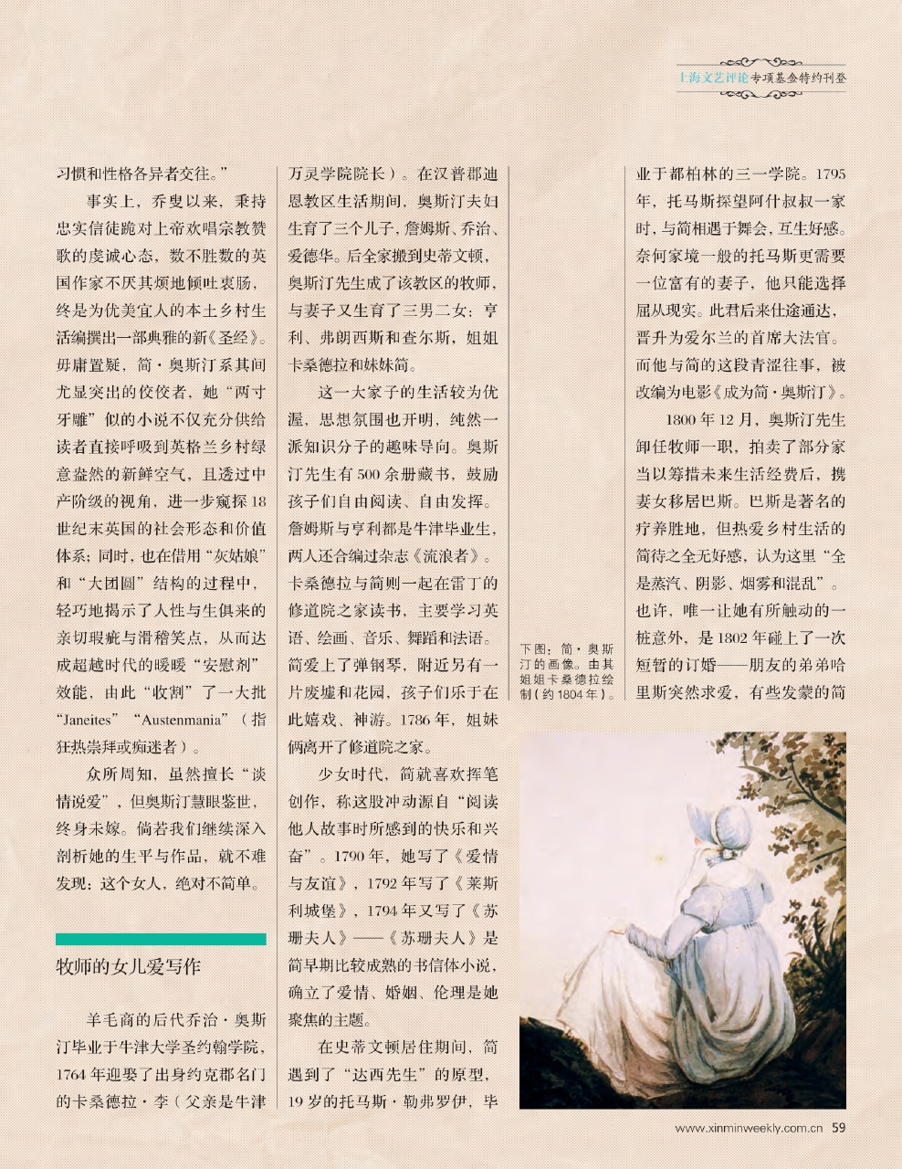 1924年,吉卜林发表了短篇小说《简迷》,故事概要是一战中的四位士兵,在战壕中结成了奥斯汀同好会,建立起亲密的感情。凯伦·乔伊·福勒的《奥斯汀书会》(2007年改编成电影)“大纲”相近:几个性格迥异的会员,各怀心思地捧着奥斯汀的小说,坐到一块分享各自的观点。现在,根据奥斯汀作品衍生出的那些“英伦古装剧”兼有广告效应,一经上映,不时掀起巴斯、莱姆等地的旅游热潮。女作家生前与衣、食、住、行的种种瓜葛(比如佳肴菜单、针线刺绣之类),则不断加速推动以“奥斯汀”为招牌的“文化产业”。动辄甩出晦涩单词、孤高自持的学院派仍在讨论她,就中意英国乡村及相应居家用度、“繁文缛节”那套的普通读者,也和她保持着活跃的联系。形形色色的受众七嘴八舌,万花筒中的简·奥斯汀女士缤纷多彩,在新的阅览条件下,被重新唤醒和激活。