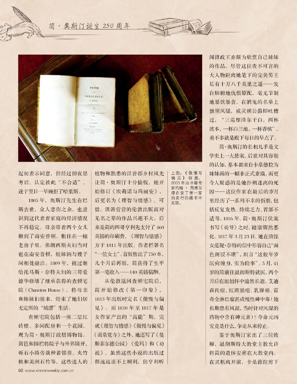查顿宅院包括一座二层红砖楼、多间配房和一个花园,现为简·奥斯汀故居博物馆。篱笆和围栏将院子与外界隔开,砾石小路旁栽种着锦葵、夹竹桃和美洲石竹等。这些迷人的植物和熟悉的汉普郡乡村风光让简·奥斯汀十分愉悦,她开始修订《埃莉诺与玛丽安》,后更名为《理智与情感》。可惜,汲汲营营的伦敦出版商对无名之辈的作品兴趣不大,后来是简的四哥亨利先支付了460英镑的印刷费,《理智与情感》方于1811年出版,作者栏署名“一位女士”。首版售出了750本,几个月后再版,简获得了生平第一笔收入——140英镑稿酬。