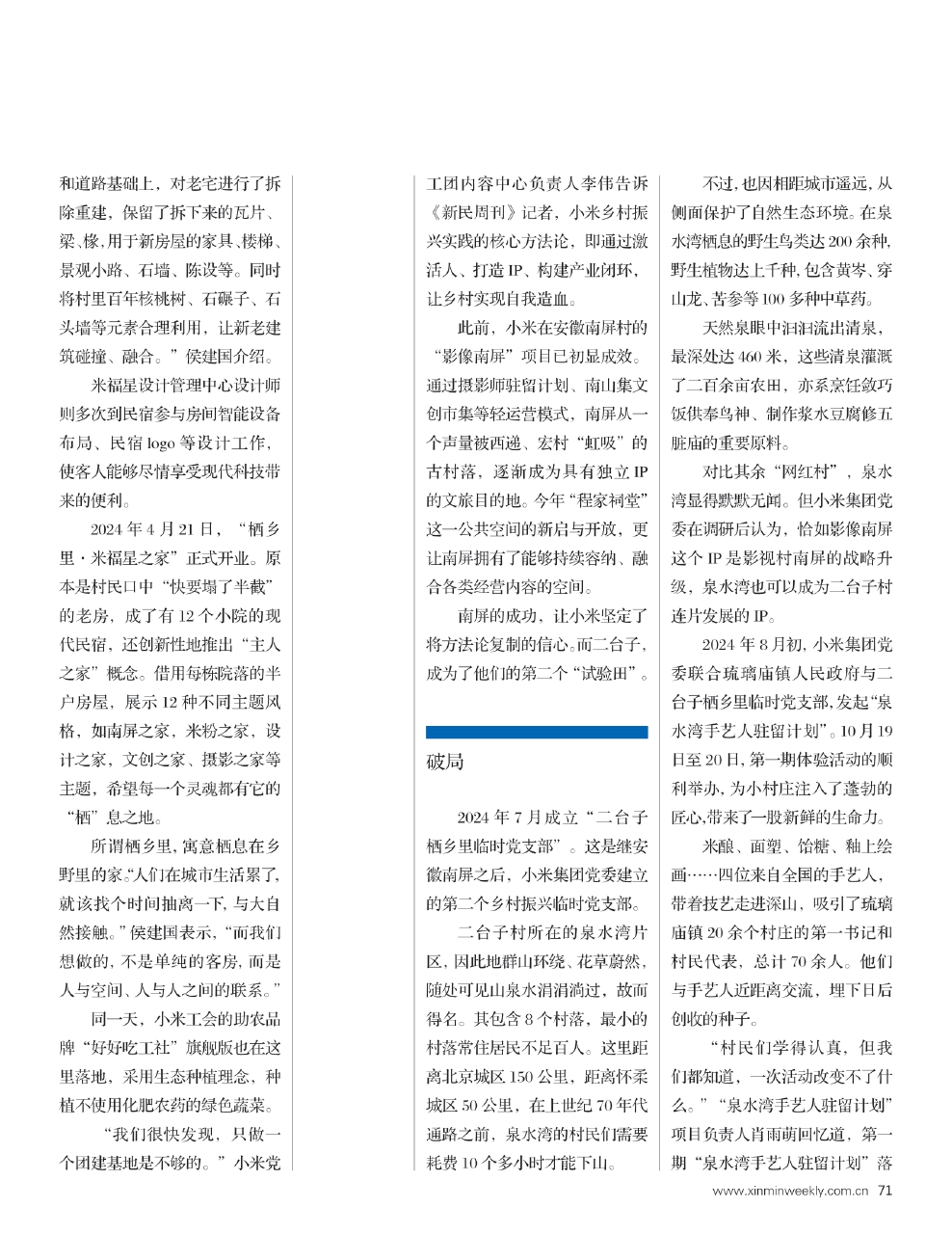 “我们很快发现,只做一个团建基地是不够的。”小米党工团内容中心负责人李伟告诉《新民周刊》记者,小米乡村振兴实践的核心方法论,即通过激活人、打造IP、构建产业闭环,让乡村实现自我造血。
