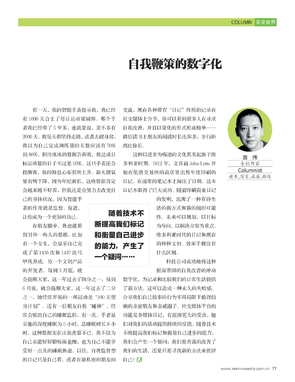 在朋友圈中,我也能看到另外一些人的数据,比如有一个女生,会显示自己完成了第1436次和1437次马甲线养成。另一个文创产品的开发者,每到3月底,就会提醒大家,这一年过去了四分之一,每到6月底,就会提醒大家,这一年过去了二分之一,她经常开展的一项运动是“100天塑身计划”。还有一位朋友自称“睡神”,经常会贴出自己的睡眠监控,有一次,手表显示他的深度睡眠为5小时,总睡眠时长8小时,这种数据实在让我羡慕不已,我不仅为自己未能好好锻炼而羞愧,也为自己不能享受好一点儿的睡眠焦虑。以往,自我监督型的日记只是自己看,或者在最私密的朋友间交流,现在各种带有“日记”性质的记录在社交媒体上分享,你可以看到很多人在寻求自我改善,并且以量化的形式形成榜单——微信读书上朋友的阅读时长比你多,步行距离比你长。