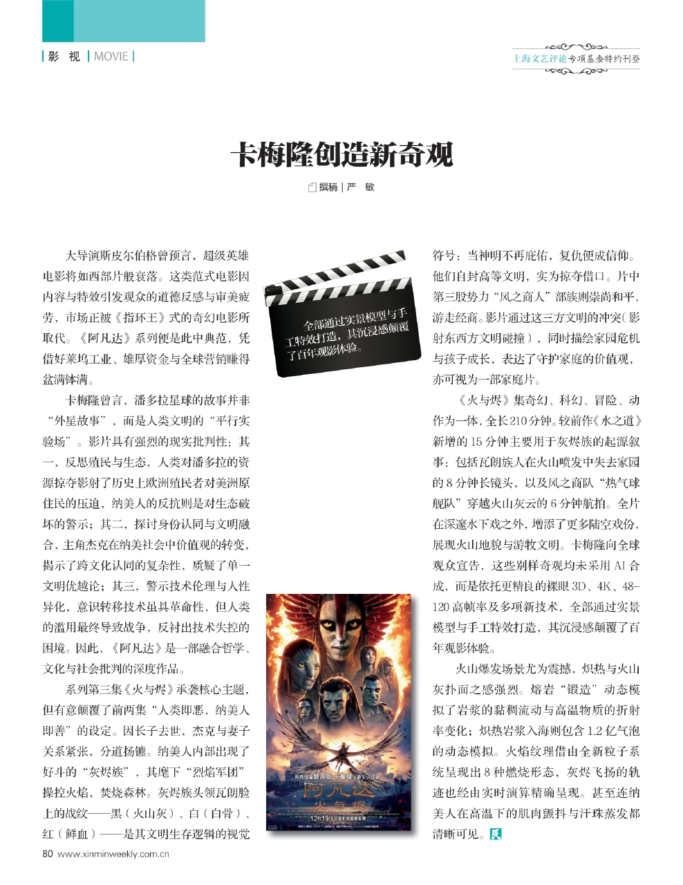 《火与烬》集奇幻、科幻、冒险、动作为一体,全长210分钟。较前作《水之道》新增的15分钟主要用于灰烬族的起源叙事:包括瓦朗族人在火山喷发中失去家园的8分钟长镜头,以及风之商队“热气球舰队”穿越火山灰云的6分钟航拍。全片在深邃水下戏之外,增添了更多陆空戏份,展现火山地貌与游牧文明。卡梅隆向全球观众宣告,这些别样奇观均未采用AI合成,而是依托更精良的裸眼3D、4K、48-120高帧率及多项新技术,全部通过实景模型与手工特效打造,其沉浸感颠覆了百年观影体验。