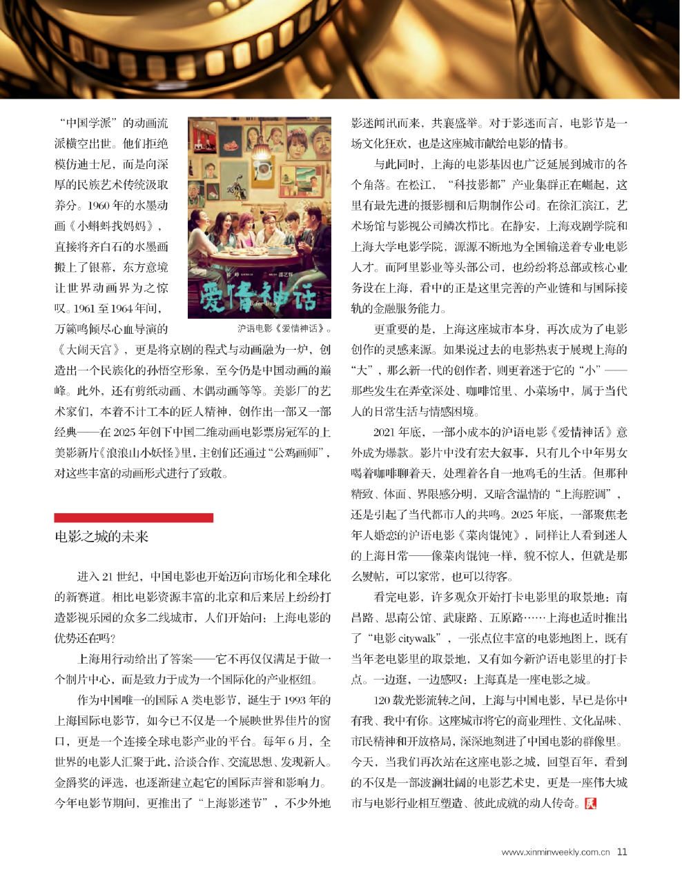 说起来,上海对新中国电影的贡献,还有一个独特之处——上海美术电影制片厂。美影厂的诞生,本身就是一个传奇。万氏四兄弟作为中国动画的开创者,在战火纷飞的40年代就制作出亚洲第一部动画长片《铁扇公主》,深深影响了后来日本的“漫画之神”手冢治虫。新中国成立后,他们和一大批艺术家齐聚上海,决意要创造出属于中国自己的动画风格——于是,一个被称为“中国学派”的动画流派横空出世。他们拒绝模仿迪士尼,而是向深厚的民族艺术传统汲取养分。1960年的水墨动画《小蝌蚪找妈妈》,直接将齐白石的水墨画搬上了银幕,东方意境让世界动画界为之惊叹。1961至1964年间,万籁鸣倾尽心血导演的《大闹天宫》,更是将京剧的程式与动画融为一炉,创造出一个民族化的孙悟空形象,至今仍是中国动画的巅峰。此外,还有剪纸动画、木偶动画等等。美影厂的艺术家们,本着不计工本的匠人精神,创作出一部又一部经典——在2025年创下中国二维动画电影票房冠军的上美影新片《浪浪山小妖怪》里,主创们还通过“公鸡画师”,对这些丰富的动画形式进行了致敬。