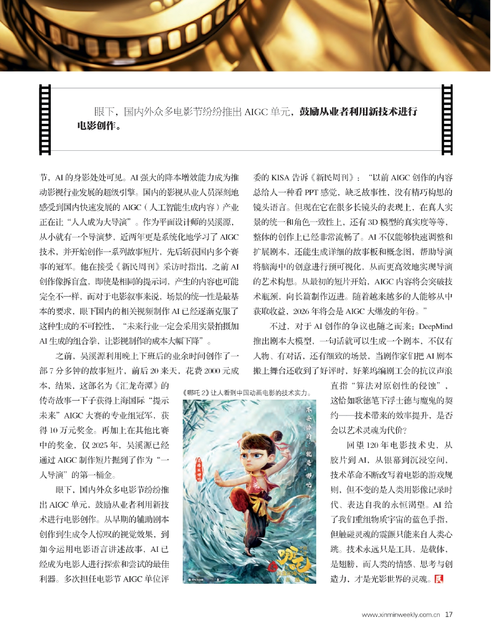 眼下,国内外众多电影节纷纷推出AIGC单元,鼓励从业者利用新技术进行电影创作。从早期的辅助剧本创作到生成令人惊叹的视觉效果,到如今运用电影语言讲述故事,AI已经成为电影人进行探索和尝试的最佳利器。多次担任电影节AIGC单位评委的KISA告诉《新民周刊》:“以前AIGC创作的内容总给人一种看PPT感觉,缺乏故事性,没有精巧构思的镜头语言。但现在它在很多长镜头的表现上,在真人实景的统一和角色一致性上,还有3D模型的真实度等等,整体的创作上已经非常流畅了。AI不仅能够快速调整和扩展剧本,还能生成详细的故事板和概念图,帮助导演将脑海中的创意进行预可视化,从而更高效地实现导演的艺术构想。从最初的短片开始,AIGC内容将会突破技术瓶颈,向长篇制作迈进。随着越来越多的人能够从中获取收益,2026年将会是AIGC大爆发的年份。”
