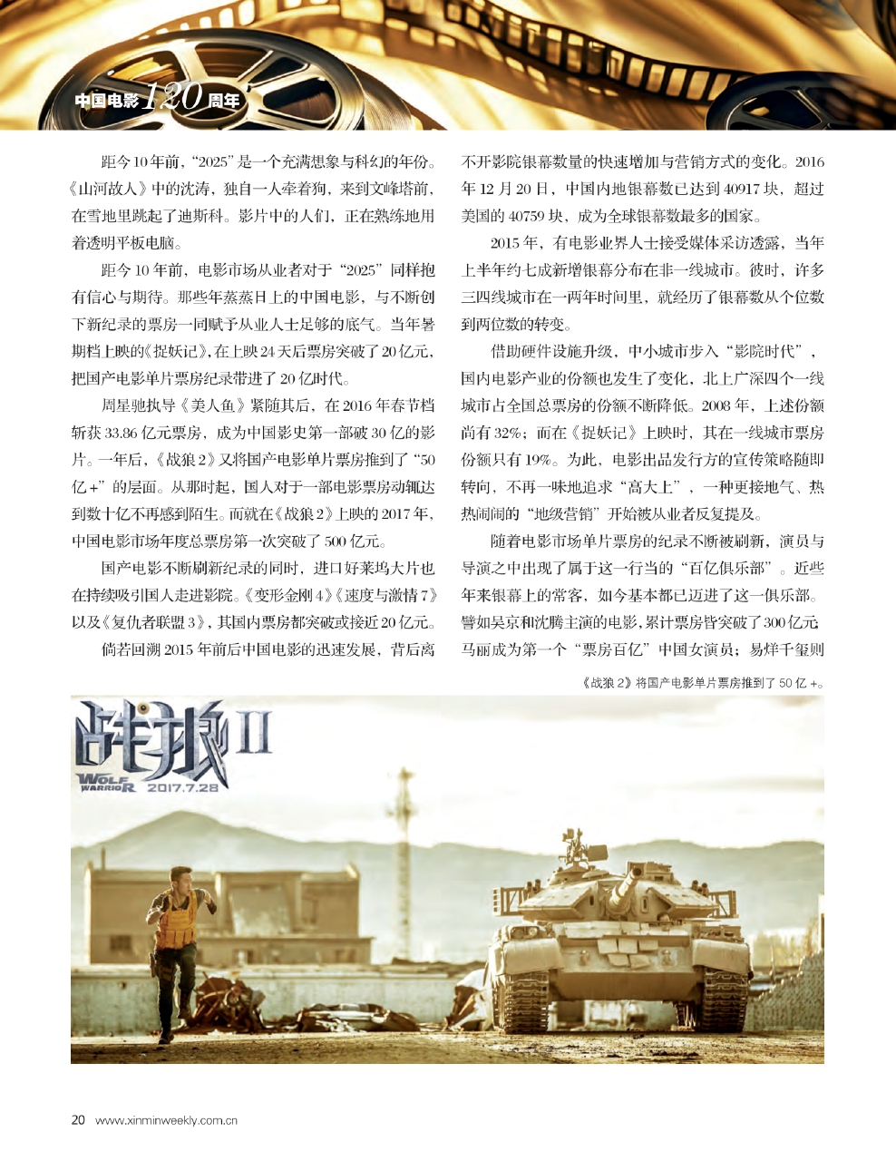 周星驰执导《美人鱼》紧随其后,在2016年春节档斩获33.86亿元票房,成为中国影史第一部破30亿的影片。一年后,《战狼2》又将国产电影单片票房推到了“50亿+”的层面。从那时起,国人对于一部电影票房动辄达到数十亿不再感到陌生。而就在《战狼2》上映的2017年,中国电影市场年度总票房第一次突破了500亿元。