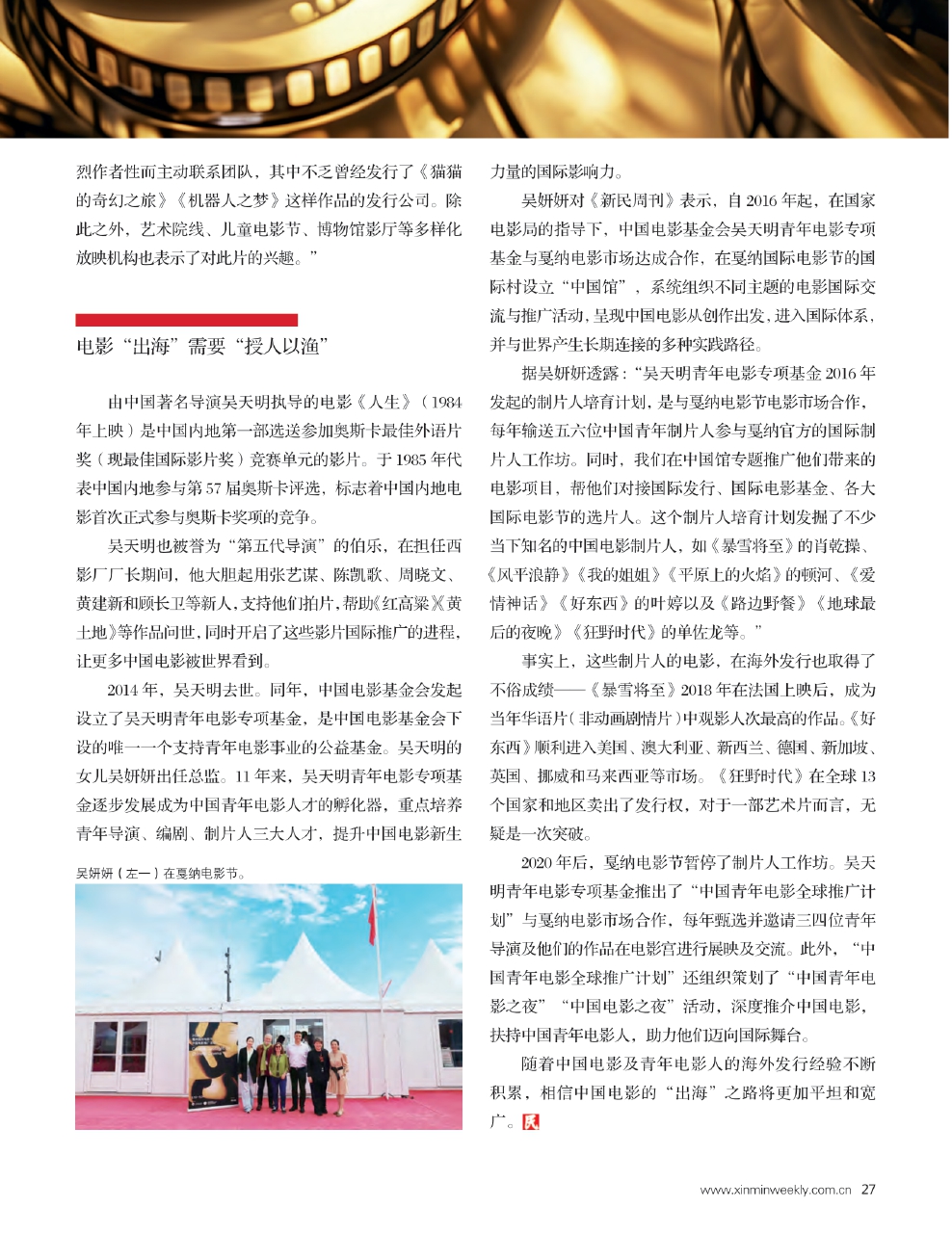 吴妍妍对《新民周刊》表示,自2016年起,在国家电影局的指导下,中国电影基金会吴天明青年电影专项基金与戛纳电影市场达成合作,在戛纳国际电影节的国际村设立“中国馆”,系统组织不同主题的电影国际交流与推广活动,呈现中国电影从创作出发,进入国际体系,并与世界产生长期连接的多种实践路径。