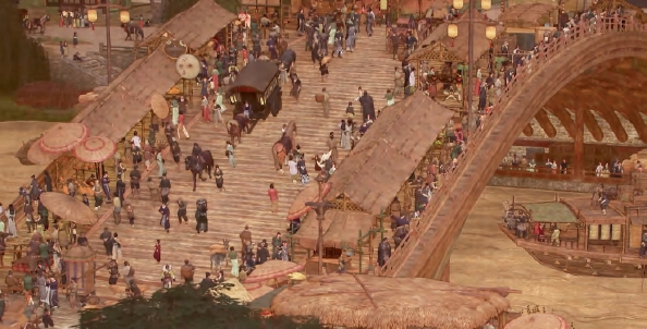 在完成清河地区的剧情任务后,玩家会触发“前往开封”主线任务。为了再现唐宋时期的市井生活,让玩家能够沉浸式体验到开封城最为繁华的历史场景,设计之初,项目组进行了充分的实地考察,并参考了大量的历史文献和古代绘画,对街道上的行人、店铺和市集摊位进行了细致入微的刻画,同时将开封城的标志性建筑如虹桥、樊楼、大相国寺等进行艺术化的还原,终于呈现出“还原《清明上河图》”的神奇效果。