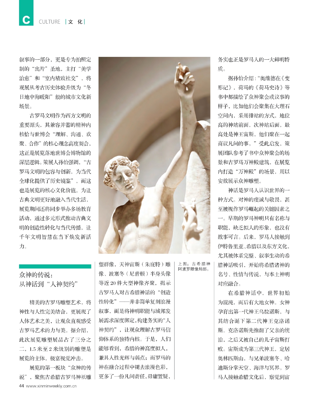 走进展厅,仿若罗马万神殿被搬来——2.27米高的宙斯(朱庇特)雕像空降,领衔阿波罗、波塞冬、雅典娜……这些世人耳熟能详的古希腊罗马诸神雕塑环绕着环形空间,巍然挺立,渐次浮现,尽显庄重。铺展辉煌又传奇的古罗马文明壮阔史诗,引领观众“一站式触摸西方古典文明艺术之光”,也为冬日的申城艺术展览增添一抹亮色。
