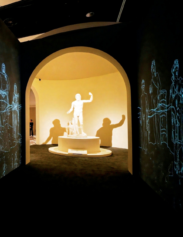 据孙怡介绍:“奥维德在《变形记》,荷马的《荷马史诗》等书中都描绘了众神聚会或议事的样子,比如他们会聚集在大理石空间内,采用排站的方式,地位高的神站前面,次神站后面,最高处是神王宙斯,他们聚在一起商议凡间的事。”受此启发,策展团队参考了书中众神聚会的场景和古罗马万神殿建筑,在展览内打造“万神殿”的场景,用以安放展示众神雕塑。