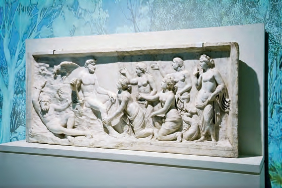 爱情场景是罗马别墅墙壁上常见的装饰,此次展出的马赛克壁画即出于此,描绘的是萨蒂尔(狄俄倪索斯的男性随从)抱着一个裸体女子,画面情态生动,细腻传神。而在古希腊的奥林匹亚遗址和希腊圣殿中,往往都有获胜运动员的雕像。罗马人复制了这些雕像,用来装饰他们的浴场、体育馆或花园。展览中,年轻运动员雕像即为一例。这个英姿飒爽、身材理想的年轻人可能是一位运动员,也可能是神话中的那喀索斯或阿多尼斯。公元前5世纪中叶,希腊雕刻家波利克里托斯在他的专著《法则》中论述了希腊艺术中的对称性和比例。