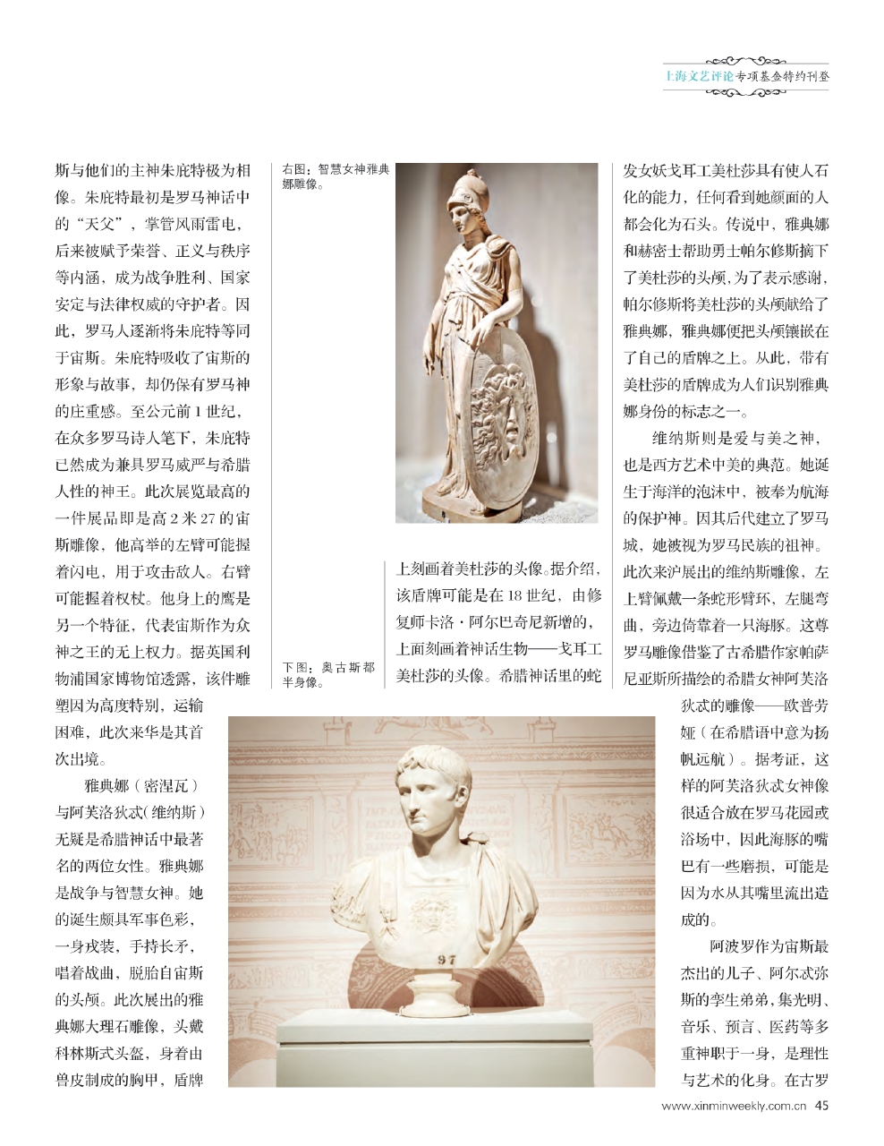 维纳斯则是爱与美之神,也是西方艺术中美的典范。她诞生于海洋的泡沫中,被奉为航海的保护神。因其后代建立了罗马城,她被视为罗马民族的祖神。此次来沪展出的维纳斯雕像,左上臂佩戴一条蛇形臂环,左腿弯曲,旁边倚靠着一只海豚。这尊罗马雕像借鉴了古希腊作家帕萨尼亚斯所描绘的希腊女神阿芙洛狄忒的雕像——欧普劳娅(在希腊语中意为扬帆远航)。据考证,这样的阿芙洛狄忒女神像很适合放在罗马花园或浴场中,因此海豚的嘴巴有一些磨损,可能是因为水从其嘴里流出造成的。