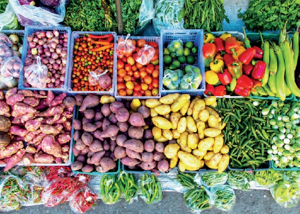上图:泰国市场摊位上五颜六色的水果和蔬菜。