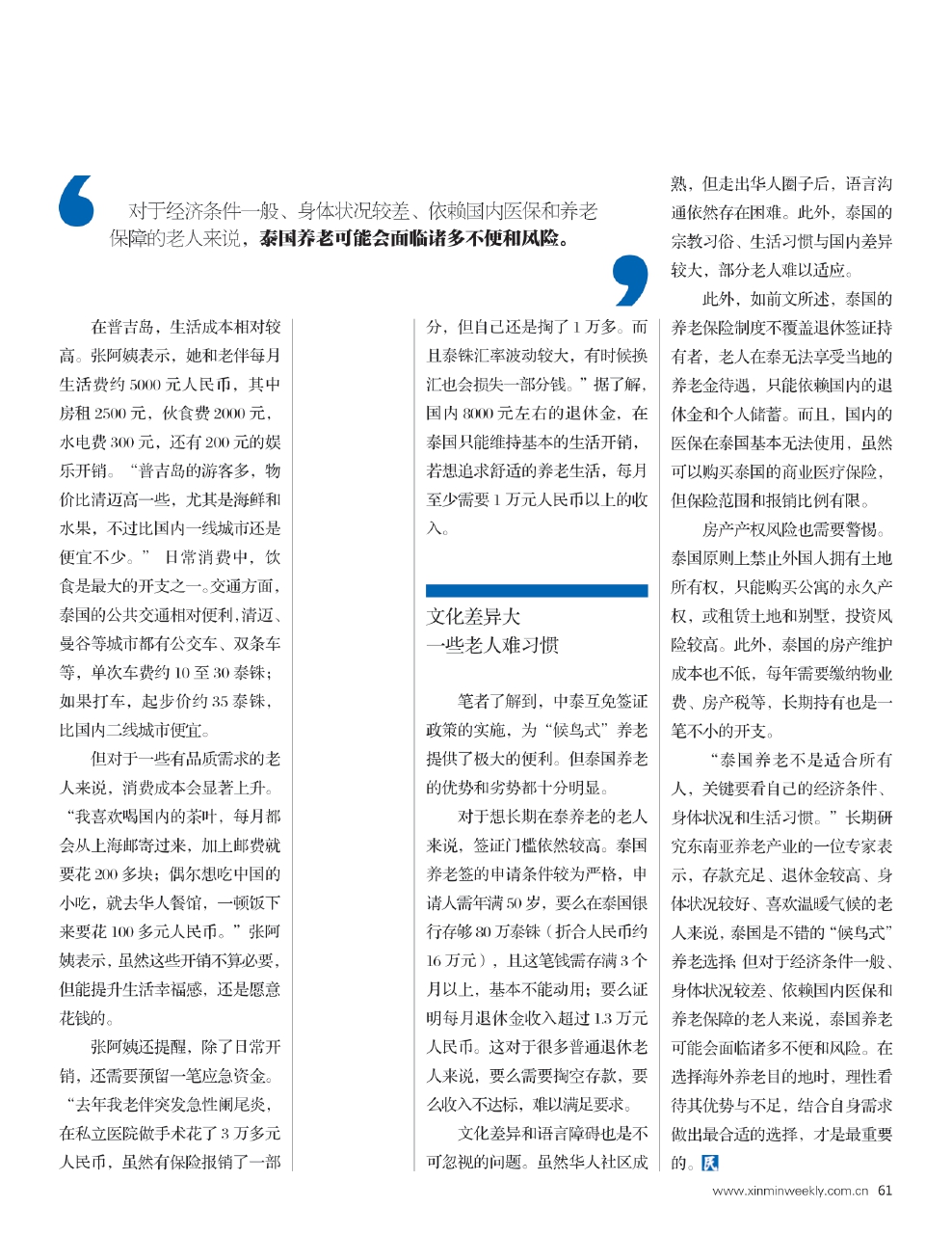 笔者了解到,中泰互免签证政策的实施,为“候鸟式”养老提供了极大的便利。但泰国养老的优势和劣势都十分明显。