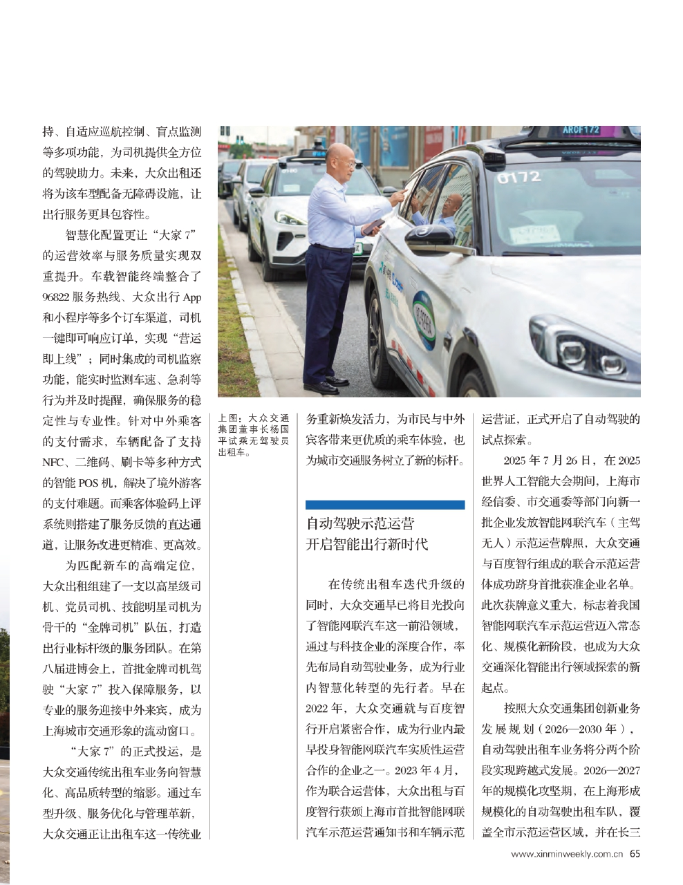 “大家7”的正式投运,是大众交通传统出租车业务向智慧化、高品质转型的缩影。通过车型升级、服务优化与管理革新,大众交通正让出租车这一传统业务重新焕发活力,为市民与中外宾客带来更优质的乘车体验,也为城市交通服务树立了新的标杆。