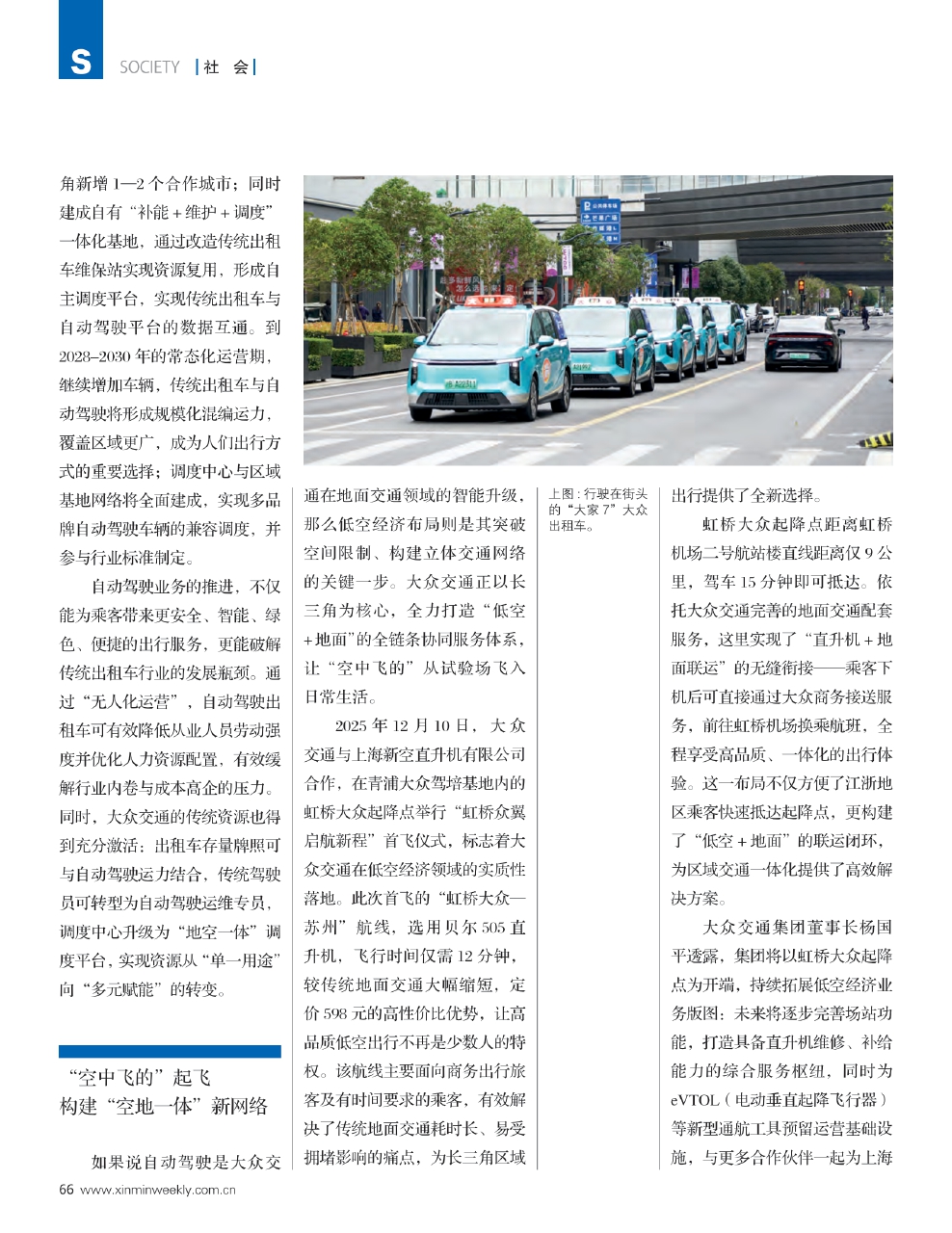 从1988年成立至今,大众交通始终站在城市交通发展的潮头。如今,随着“大家7”出租车的全面投运、自动驾驶车队的规模化拓展、低空经济网络的逐步成型,这家老牌交通企业正以创新为引擎,完成从地面交通到立体出行的跨越。未来,在“品牌卓著、创新领先、合规稳健、韧性强劲”的发展目标指引下,大众交通将持续深化数智交通、金融投资、置业发展、数据算力四大产业板块的转型,构建“数智大众”全新生态,为中国城市立体交通发展注入强劲动能,让人们的出行更便捷、更安全、更有温度。