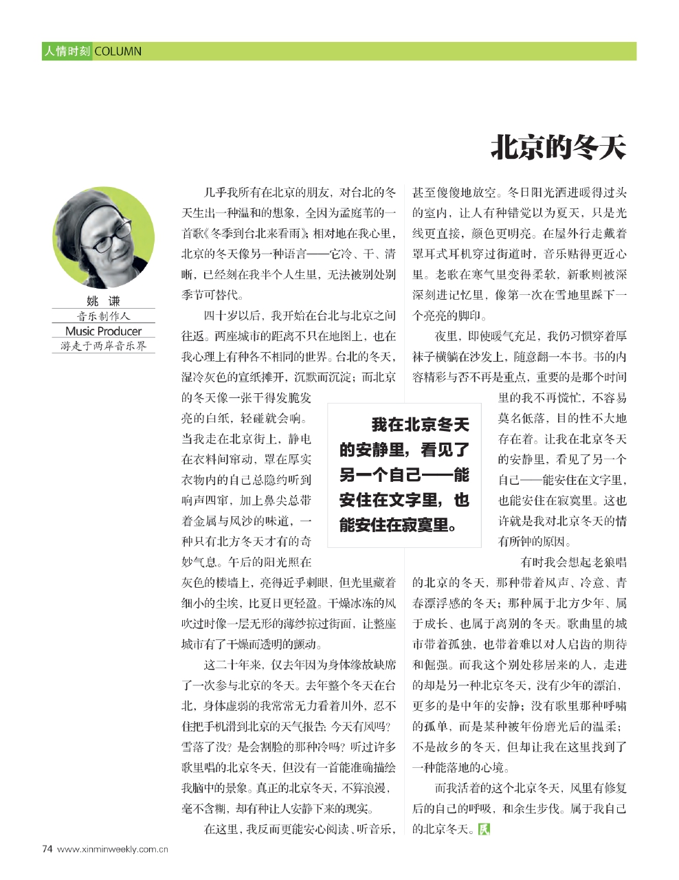 夜里,即使暖气充足,我仍习惯穿着厚袜子横躺在沙发上,随意翻一本书。书的内容精彩与否不再是重点,重要的是那个时间里的我不再慌忙,不容易莫名低落,目的性不大地存在着。让我在北京冬天的安静里,看见了另一个自己——能安住在文字里,也能安住在寂寞里。这也许就是我对北京冬天的情有所钟的原因。