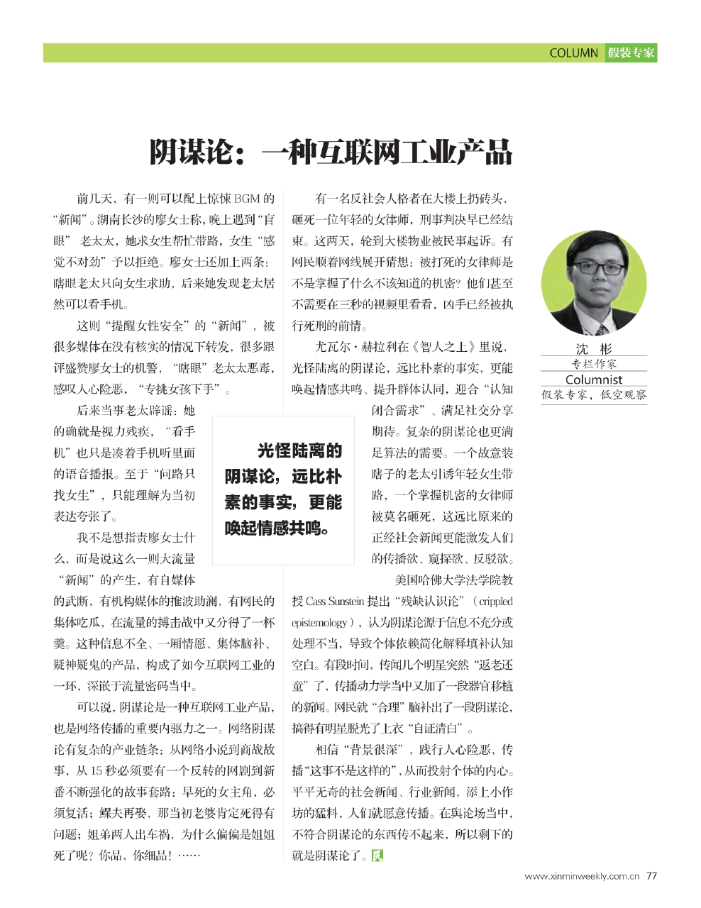 尤瓦尔·赫拉利在《智人之上》里说,光怪陆离的阴谋论,远比朴素的事实,更能唤起情感共鸣、提升群体认同,迎合“认知闭合需求”、满足社交分享期待。复杂的阴谋论也更满足算法的需要。一个故意装瞎子的老太引诱年轻女生带路,一个掌握机密的女律师被莫名砸死,这远比原来的正经社会新闻更能激发人们的传播欲、窥探欲、反驳欲。