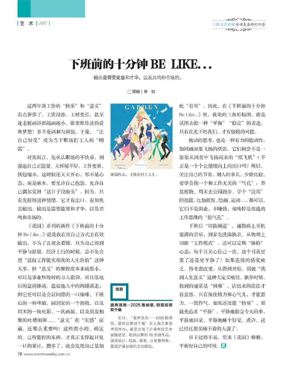 《花园》系列的新作《下班前的十分钟Be Like...》就是我在用自己方式去有效输出,不为了让观众看懂,只为自己得到平静与舒服。经济上行的时候,总不免会想“这份工作能实现我的人生价值”这种大事。但“意义”的颗粒度本来就很小,可以是事业辉煌时的万人敬仰,项目落地后的盆满钵满,造福他人中的踌躇满志;但它更可以是会议间隙的一口咖啡,下班后的一杯啤酒,回到家的一个拥抱,以及周末的一场电影、一次画展,以及朋友相聚的吐槽闲聊......“意义”在“实感”面前,还那么重要吗?这些微小的、确定的、己所能控的东西,才真正支撑起日复一日的累计,攒多了,就会发现自己是如此“有用”。因此,在《下班前的十分钟Be Like...》里,我用的三角形构图,就是试图去做一种“平衡”“稳定”的表达。只有在光下的我们,才有愉悦的可能。