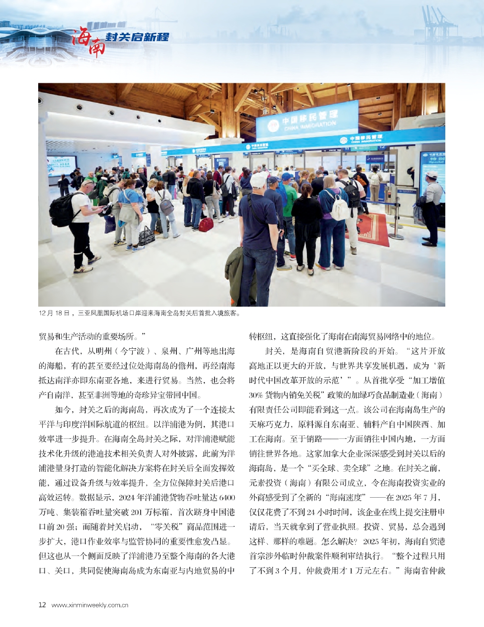 封关,是海南自贸港新阶段的开始。“这片开放高地正以更大的开放,与世界共享发展机遇,成为‘新时代中国改革开放的示范’”。从首批享受“加工增值30%货物内销免关税”政策的加绿巧食品制造业(海南)有限责任公司即能看到这一点。该公司在海南岛生产的天麻巧克力,原料源自东南亚、辅料产自中国陕西、加工在海南。至于销路——一方面销往中国内地,一方面销往世界各地。这家加拿大企业深深感受到封关以后的海南岛,是一个“买全球、卖全球”之地。在封关之前,元素投资(海南)有限公司成立,令在海南投资实业的外商感受到了全新的“海南速度”——在2025年7月,仅仅花费了不到24小时时间,该企业在线上提交注册申请后,当天就拿到了营业执照。投资、贸易,总会遇到这样、那样的难题。怎么解决?2025年初,海南自贸港首宗涉外临时仲裁案件顺利审结执行。“整个过程只用了不到3个月,仲裁费用才1万元左右。”海南省仲裁协会秘书长张引玉介绍。