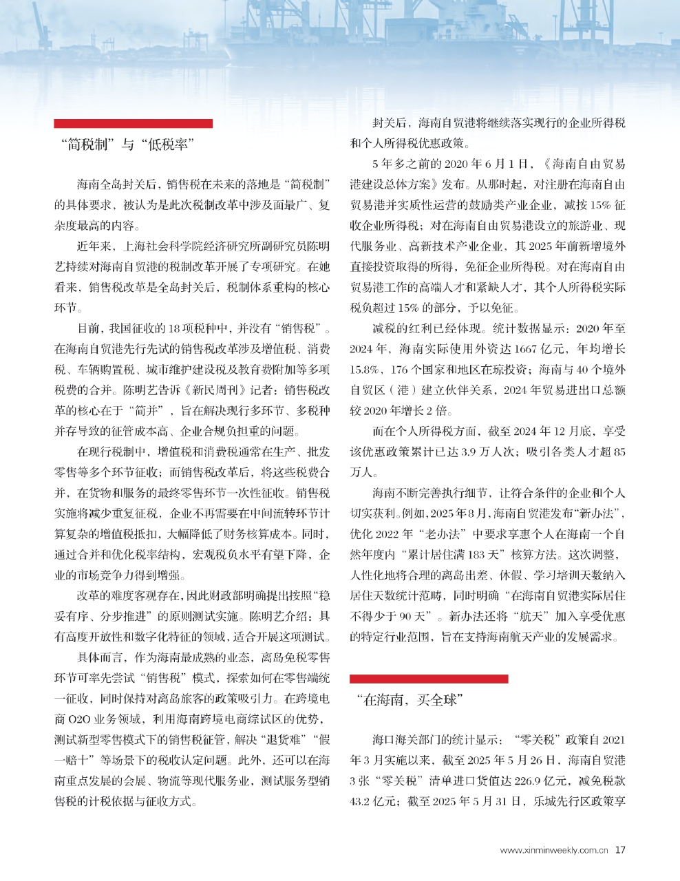 在陈明艺看来,海南正在通过一系列税制改革探索,回答一个世界级的命题:如何在一个主权国家内部,建立一个既高度开放又安全可控的特殊经济功能区。它的答案,举世瞩目。
