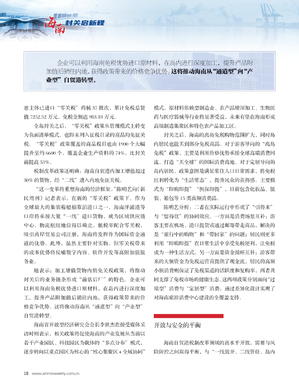 “这一变革将重塑海南的经济框架。”陈明艺向《新民周刊》记者表示。在新的“零关税”政策下,作为全球最大的集装箱船舶靠泊港口之一,海南洋浦港等口岸将承接大量“一线”进口货物,成为区域供应链中心,物流枢纽地位得以确立。低税率配合零关税,吸引离岸贸易公司注册,海南将发挥作为国际资金通道的优势。此外,虽然主要针对实物,但零关税带来的成本优势将反哺数字内容、软件开发等高附加值服务业。