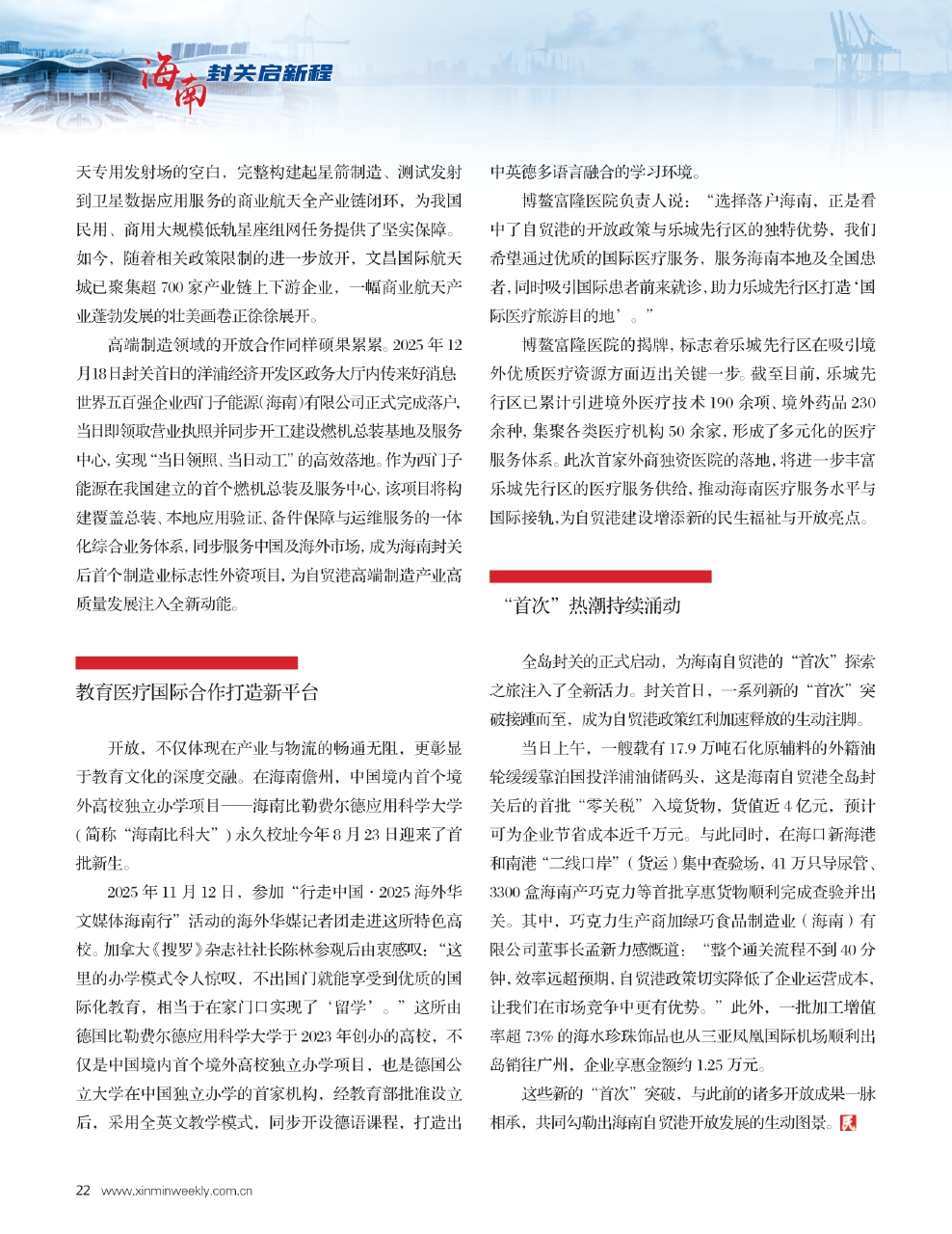 从首张“中国洋浦港”船舶国籍证书的颁发,到首条第五航权客运航线的开通;从首个境外高校独立办学项目的扎根,到首个商业航天发射场的圆满首发,海南自贸港建设的每一个“首次”都是一次敢闯敢试的大胆探索,每一个“首个”都是一次突破创新的有力见证。
